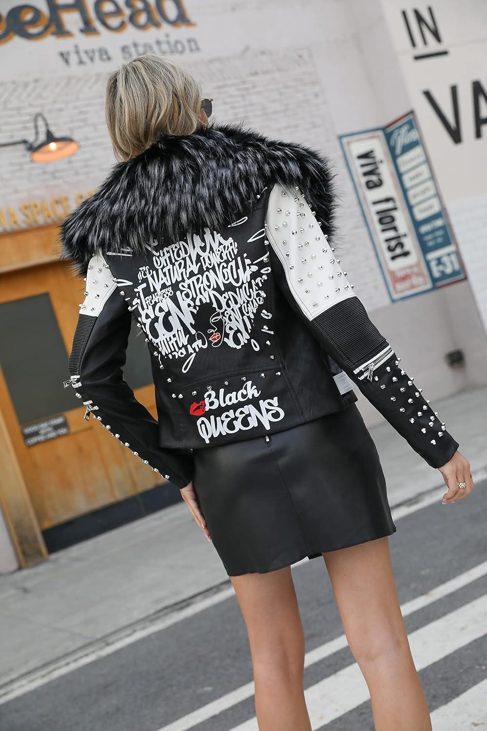 Bellivera Faux Leather Jacket for Women Studded Rivet Floral Moto Biker Short Lapel Coat(Black With Collar)
