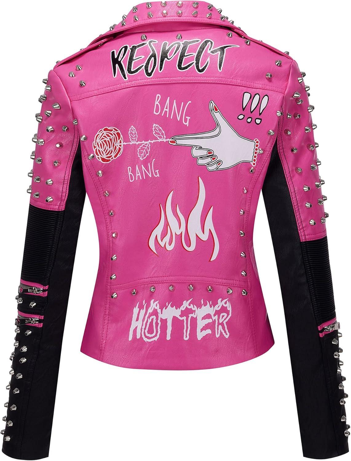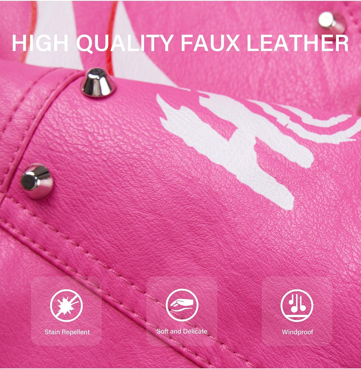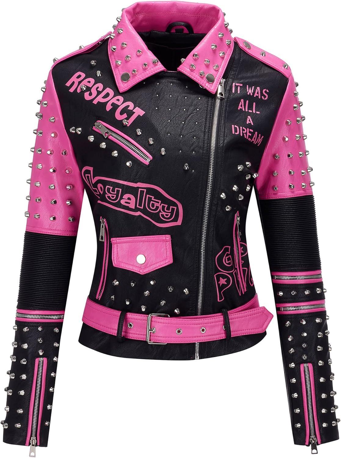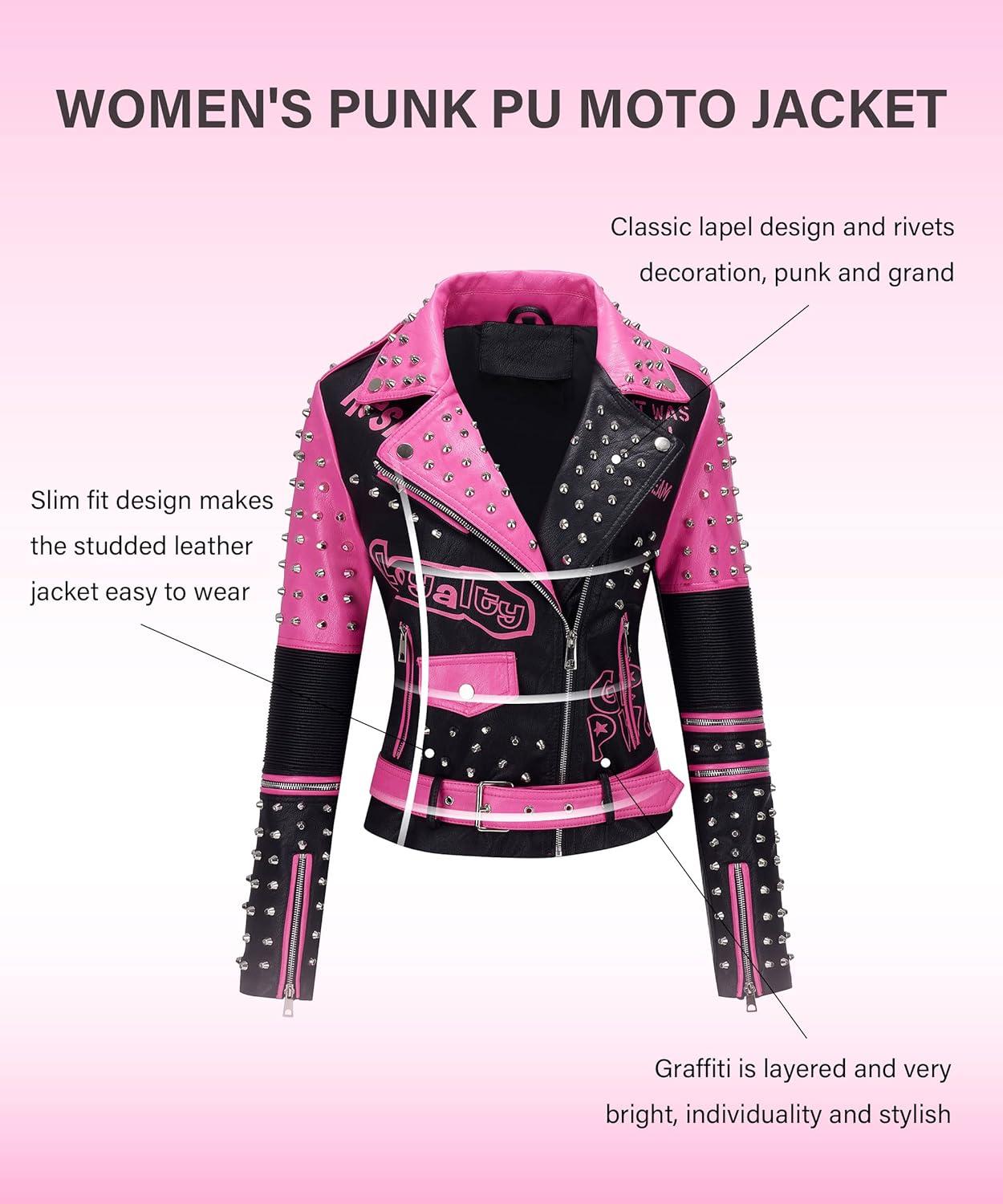 Bellivera Faux Leather Jacket for Women Studded Rivet Floral Moto Biker Short Lapel Coat(Pink Black)