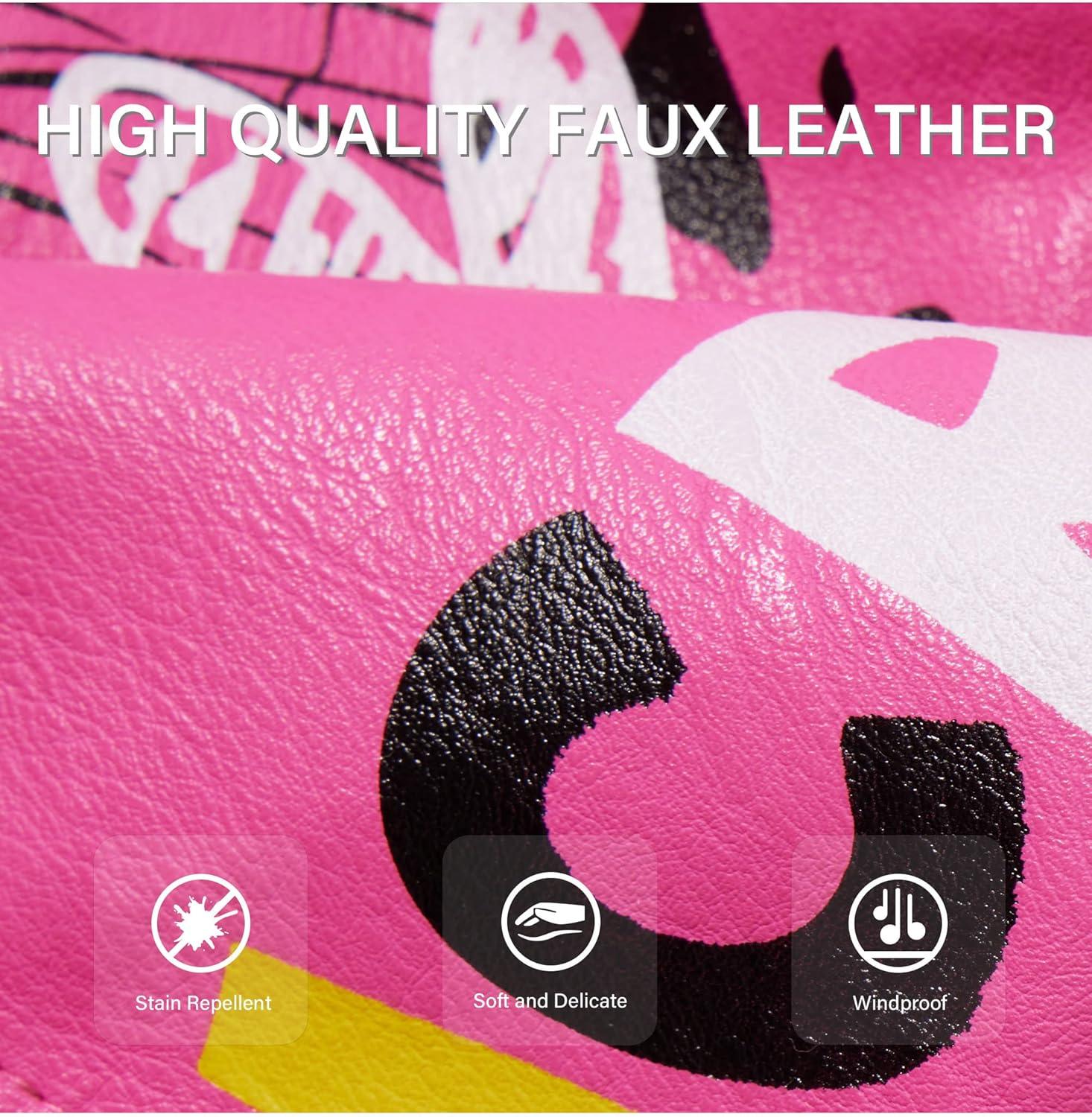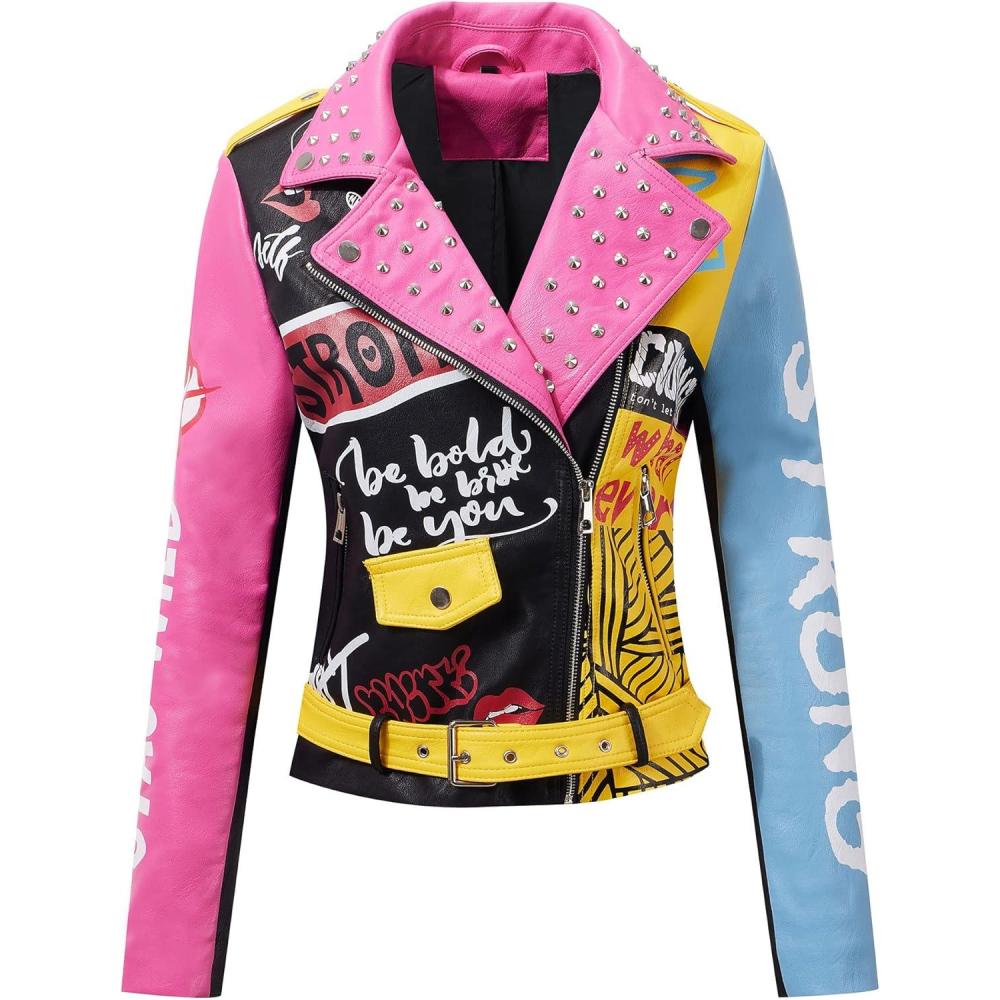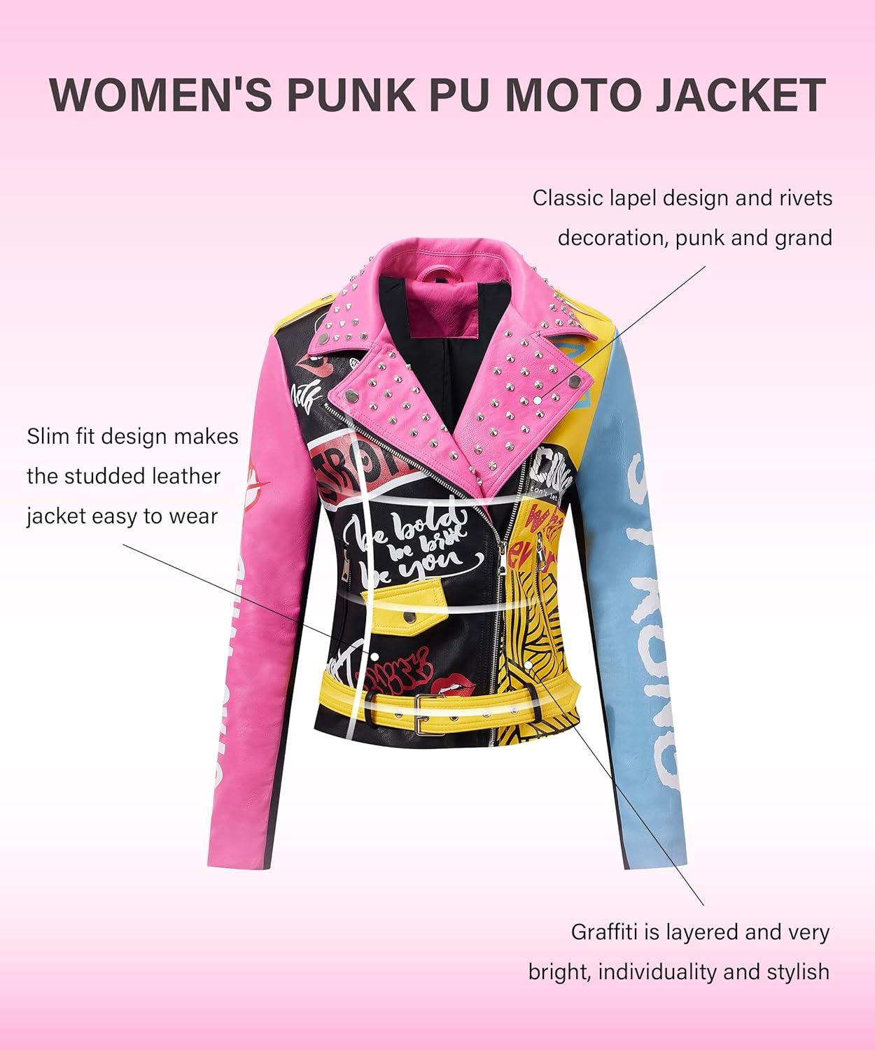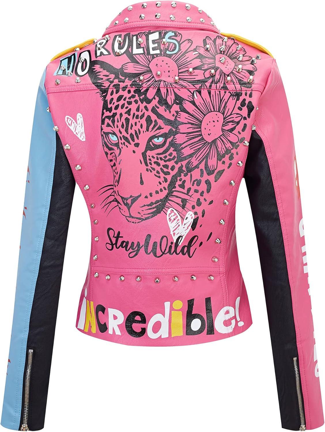 Bellivera Faux Leather Jacket for Women Studded Rivet Floral Moto Biker Short Lapel Coat(Pink Blue)
