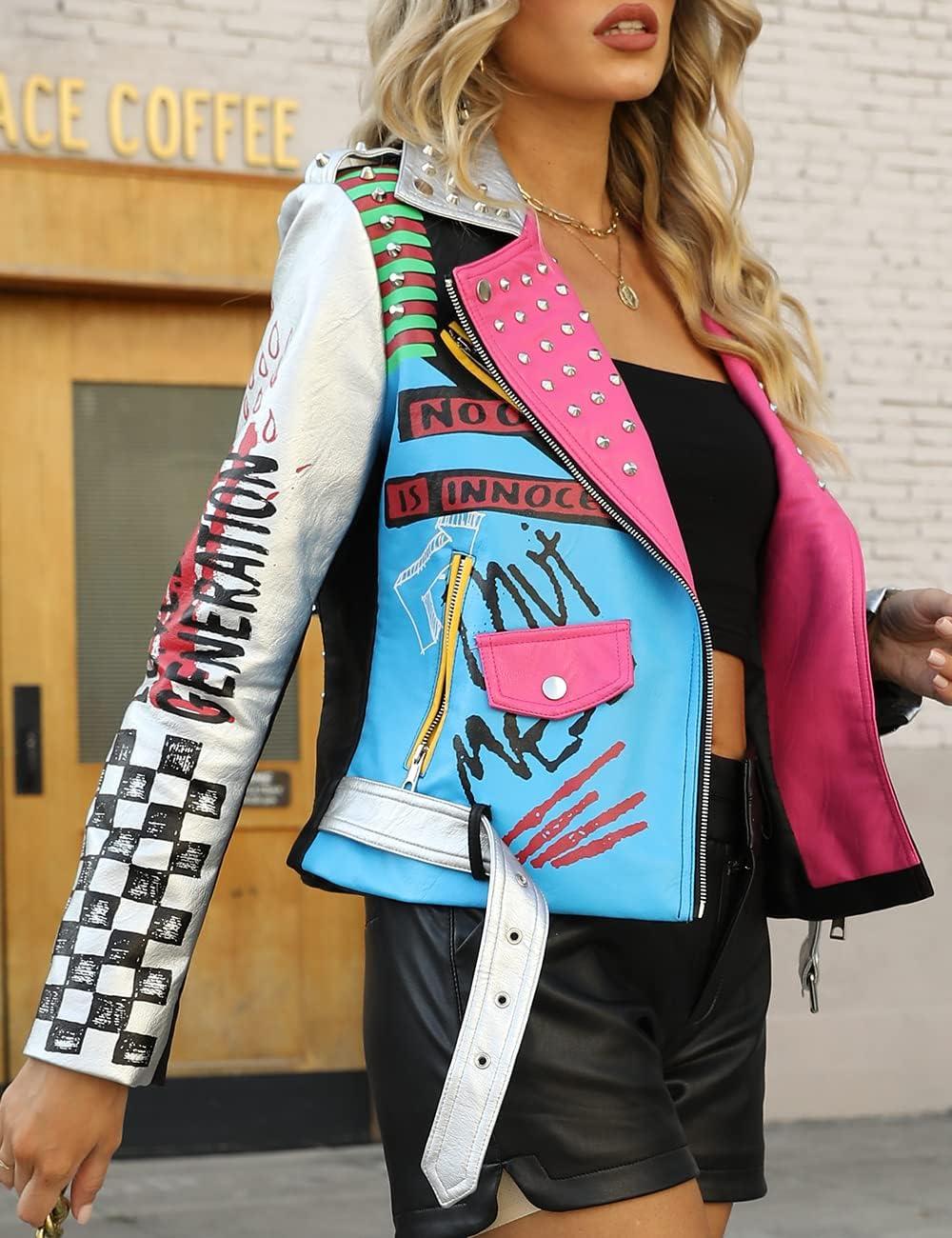 Bellivera Faux Leather Jacket for Women Studded Rivet Floral Moto Biker Short Lapel Coat(Pink Black)