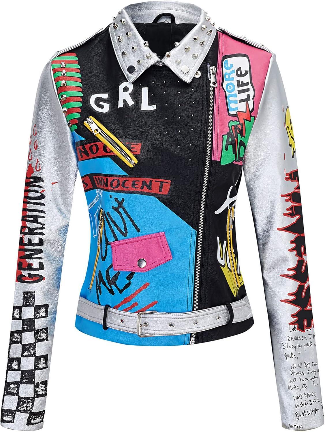 Bellivera Faux Leather Jacket for Women Studded Rivet Floral Moto Biker Short Lapel Coat(Sliver Blue)