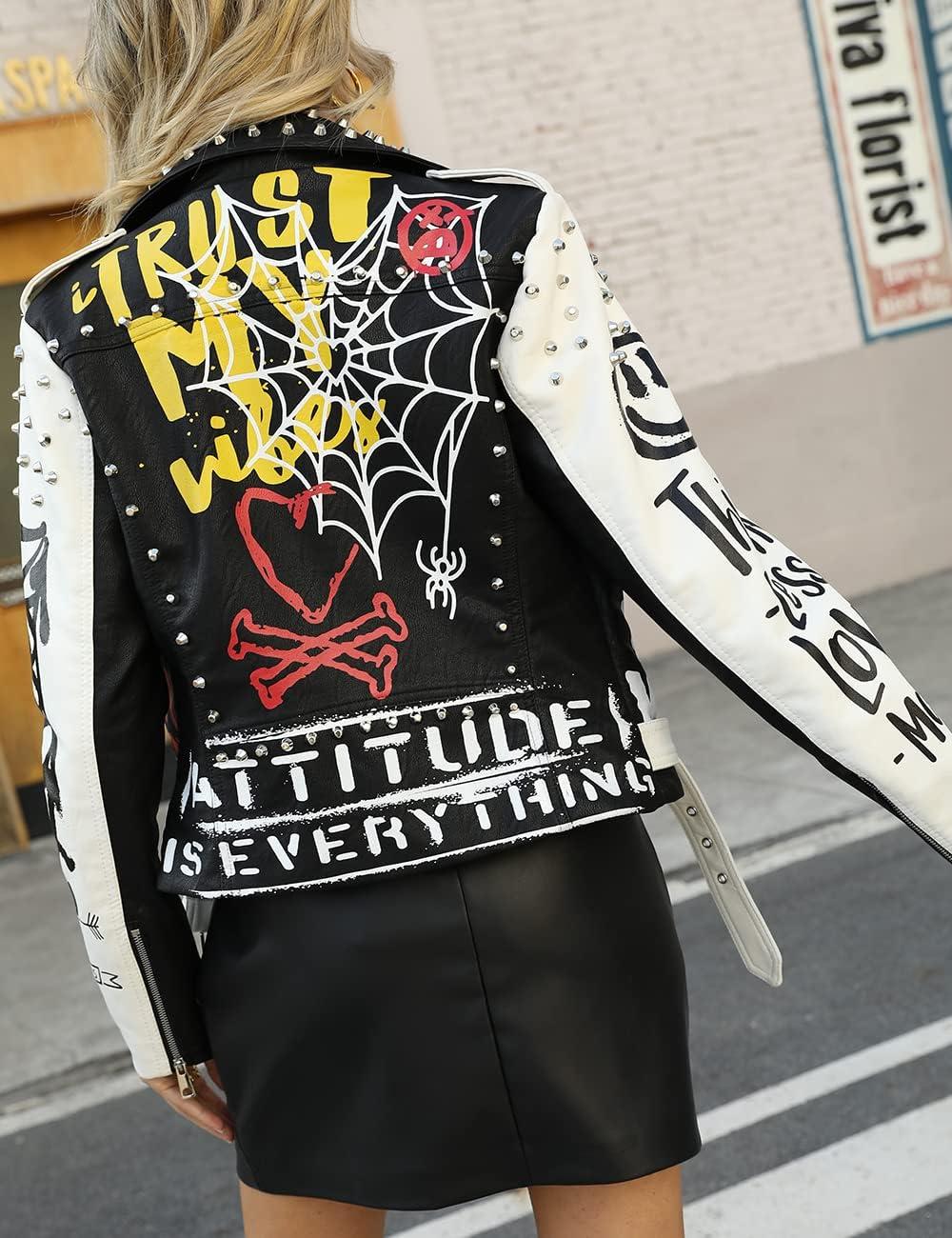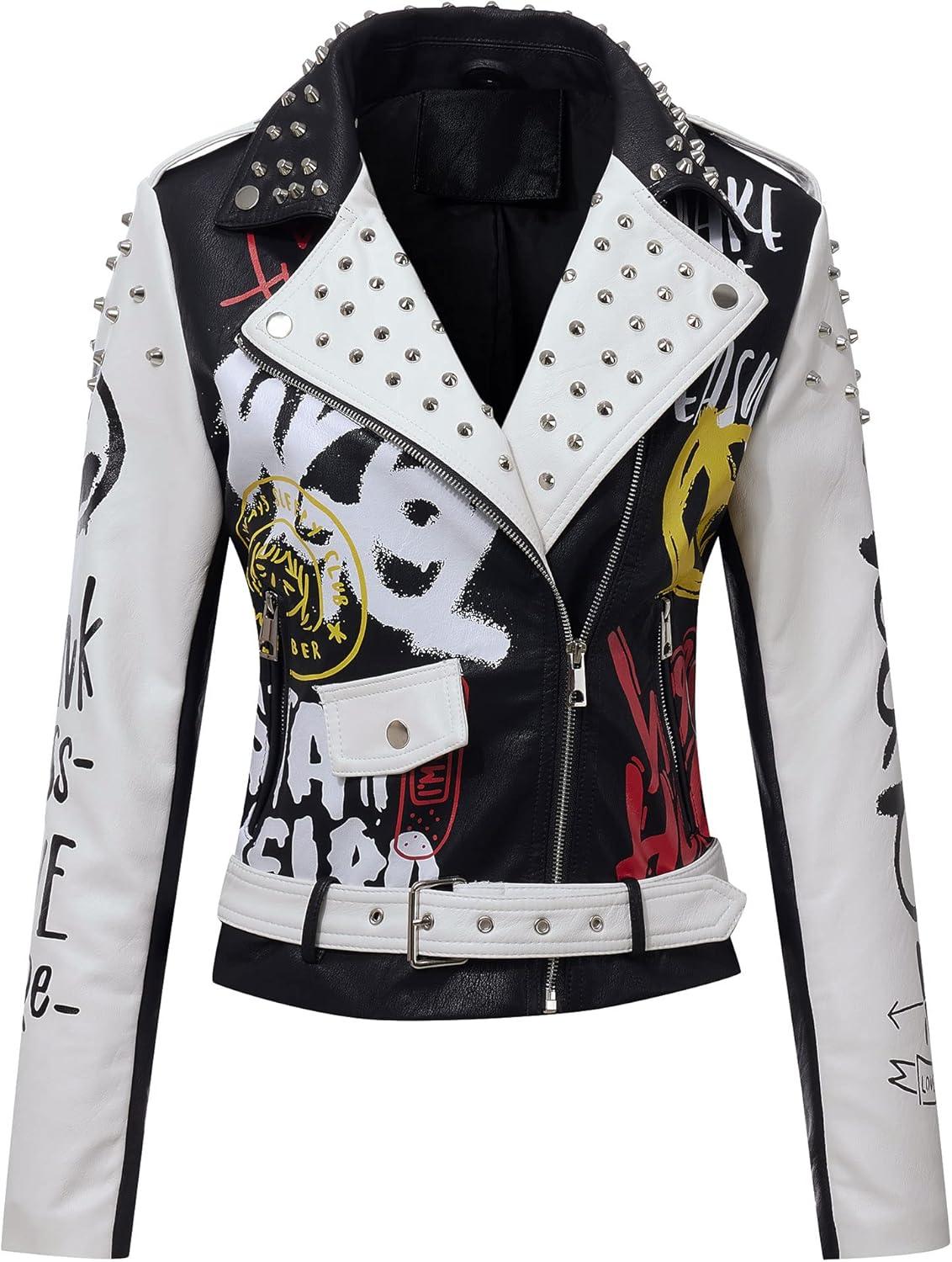 Bellivera Faux Leather Jacket for Women Studded Rivet Floral Moto Biker Short Lapel Coat(White)