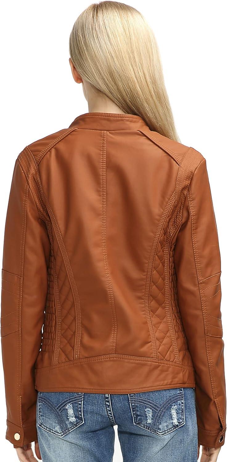 Bellivera Faux Leather Jacket Women Motorcycle Zipper Bomber PU Bike Coat with Pockets(Brown)