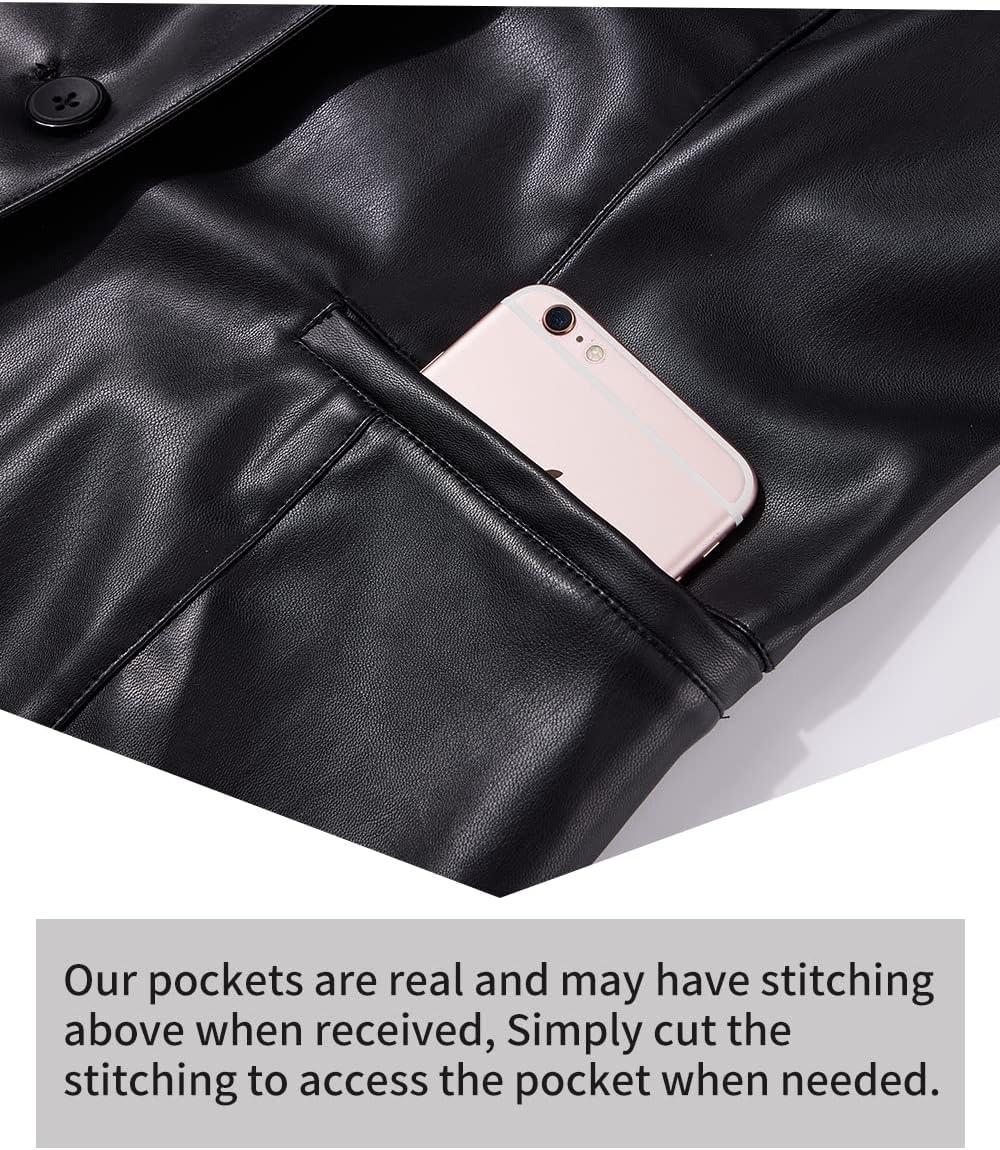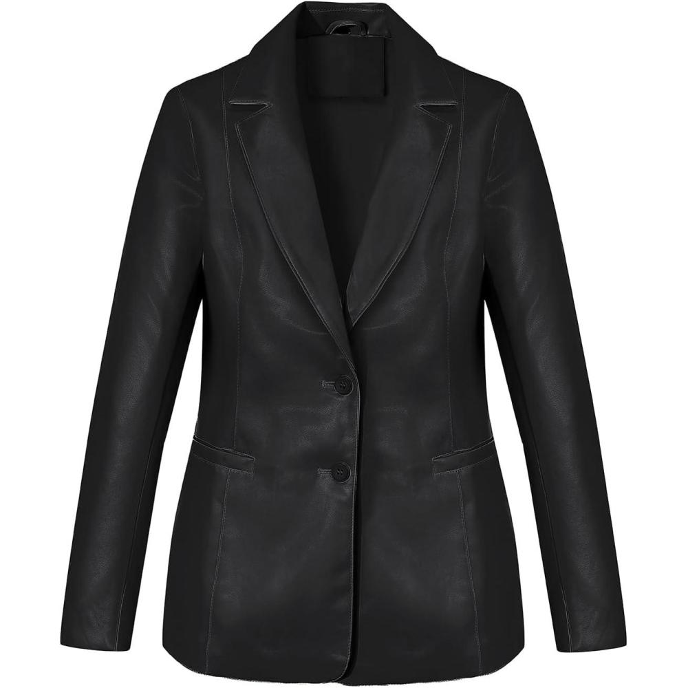 Our premium vegan PU leather outerwear delivers a luxurious feel with the added benefits of softness, suppleness, and easy maintenance. This durable material is not only stylish but also a practical choice for your wardrobe, requiring minimal care with a simple wipe-down using PU-Protector. Our blazers, crafted from this vegan leather, offer a loose fit for ultimate comfort and ease of movement, making them good for both casual lounging and professional settings. The design smartly covers the hips for a polished look that pairs effortlessly with a variety of bottoms, from pants to skirts, allowing you to transition seamlessly from day to night. The chic, trendy design of our vegan style blazers is versatile, easily complementing neutrals for a sophisticated look or adding a pop of color for a more vibrant style. With features such as notched lapels, long sleeves, and a sleek silhouette, these jackets are timeless and exude an air of elegance suitable for both casual and formal occasions. Practicality is key with our blazers, which include two zippered pockets for secure storage of essentials. The adjustable belt feature allows for a personalized fit, creating feminine curves and highlighting body proportions to suit your unique style. Choose our faux leather blazers for affordable fashion statement that doesn't compromise on luxury or style. Lighter and easier to care for than real leather, these jackets are the perfect addition to any wardrobe, offering charismatic charm for any occasion. Embrace the trend of sustainable fashion with our versatile and elegant vegan leather blazers.