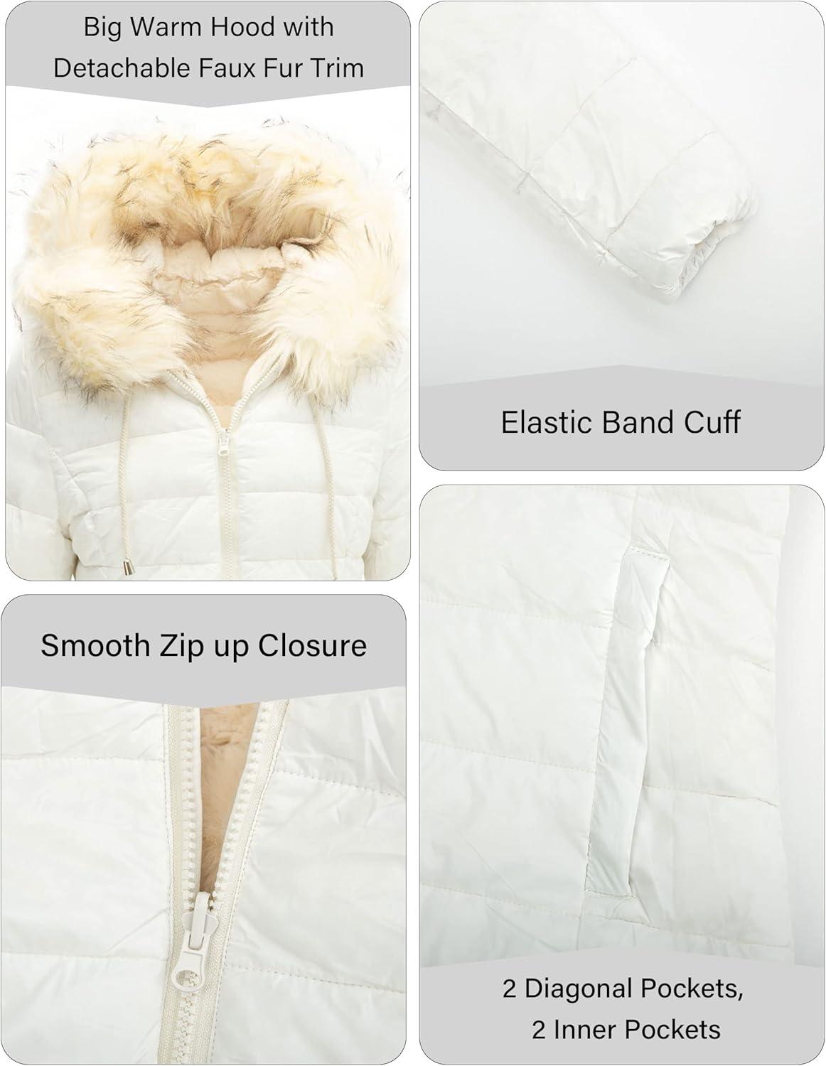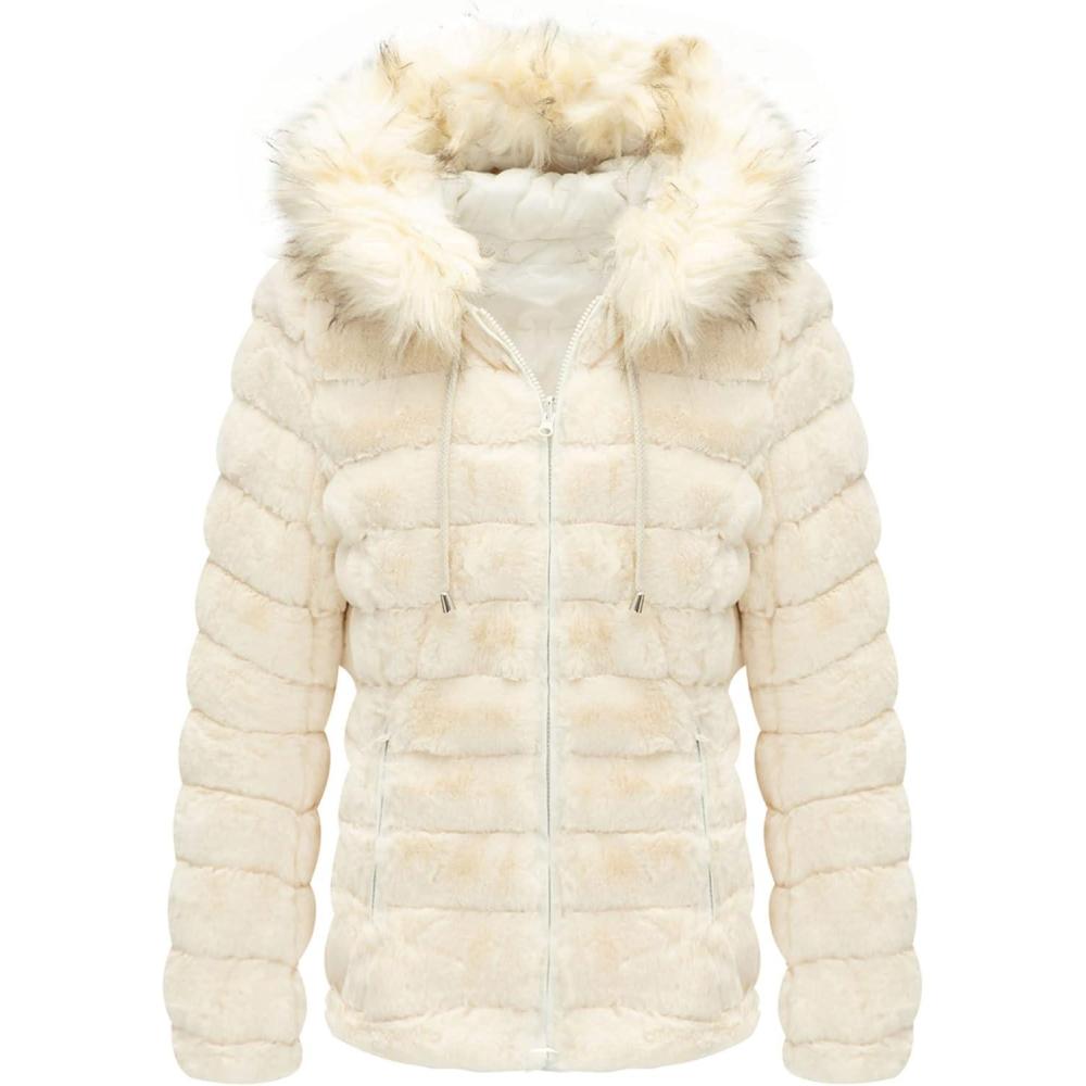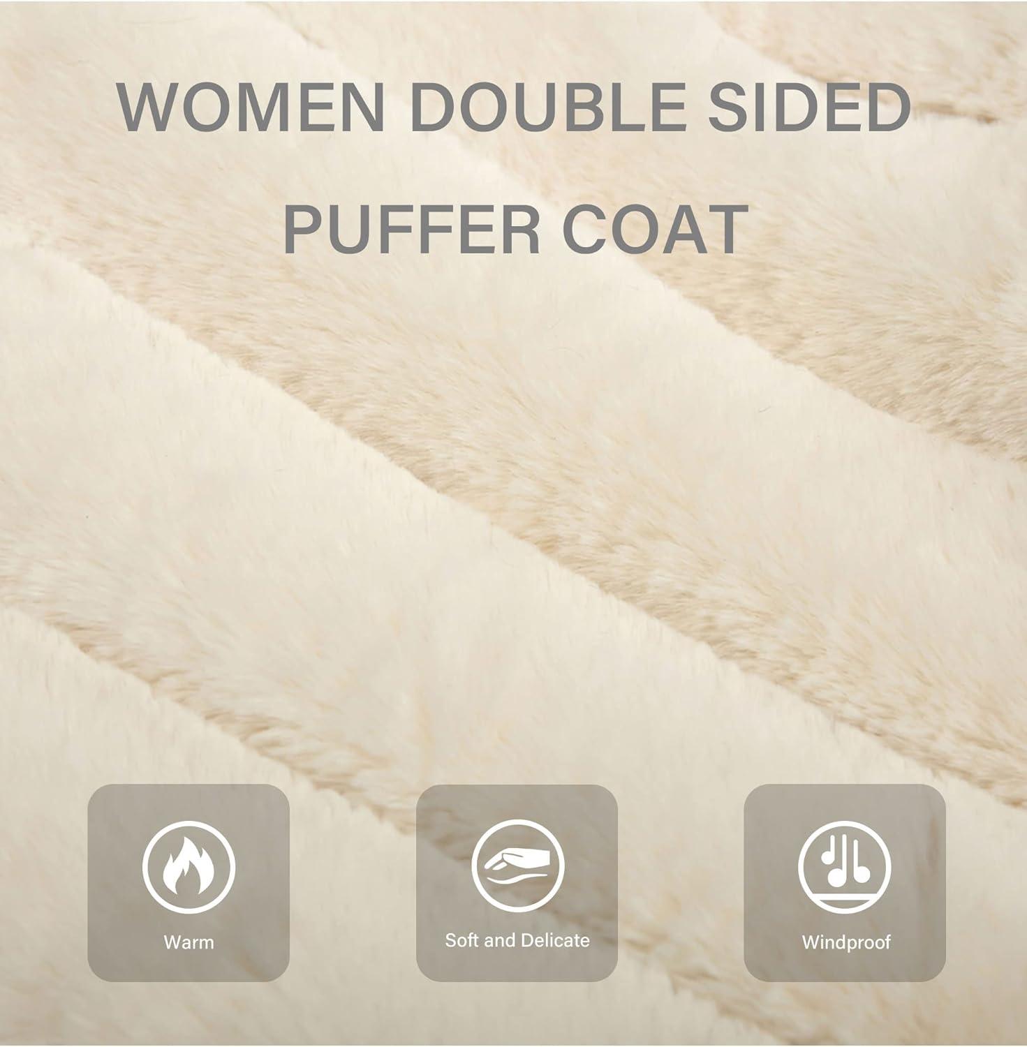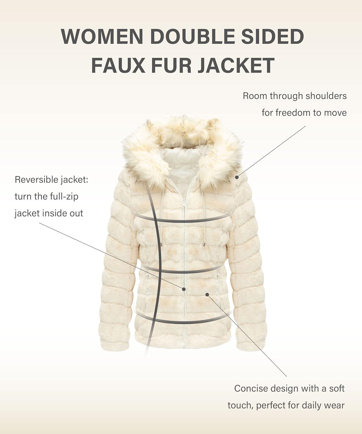 Bellivera Women Double Sided Faux Fur Jacket Spring and Winter Fashion Reversible Hood Puffer Coat with Fur Collar(White)