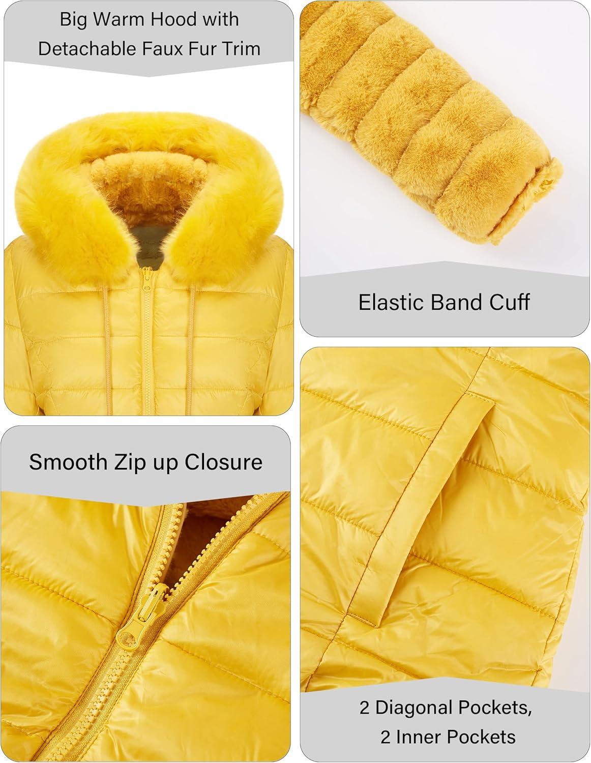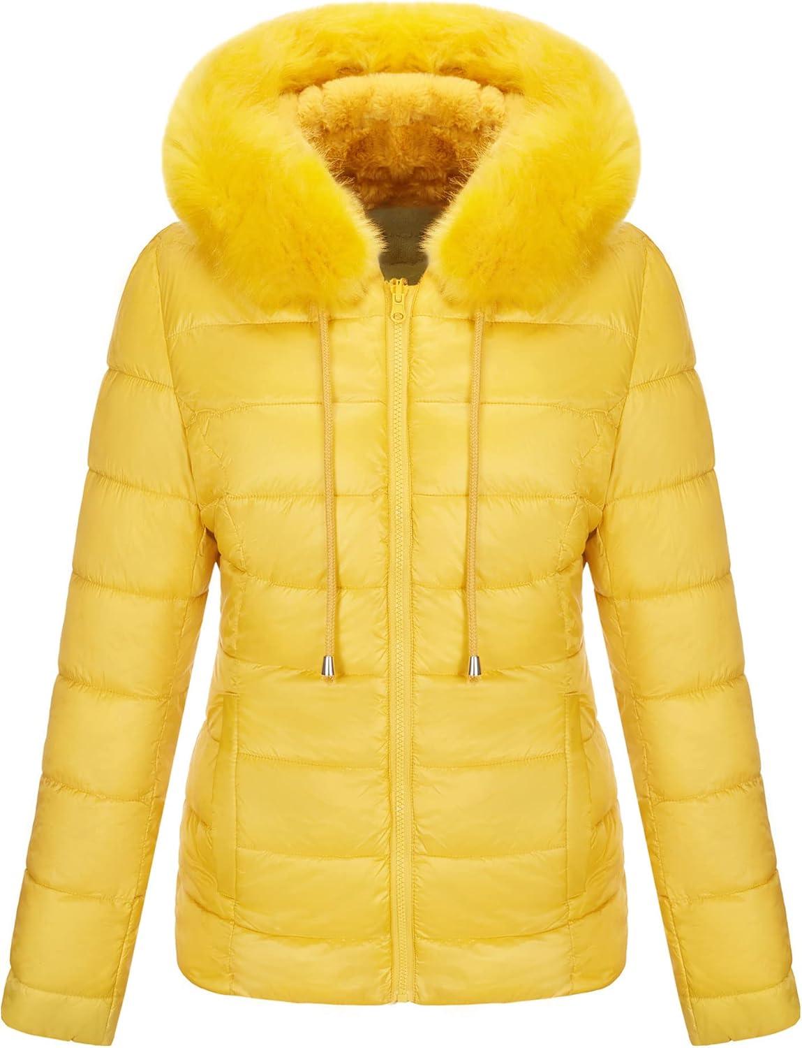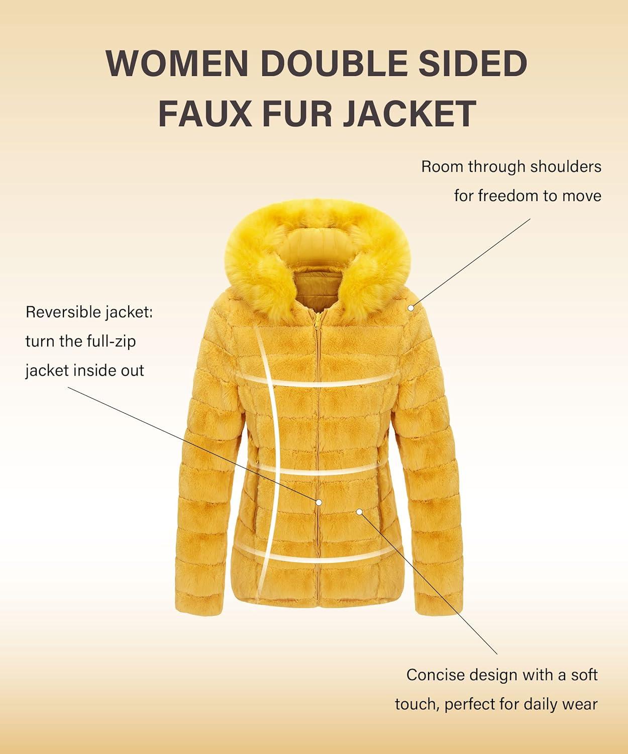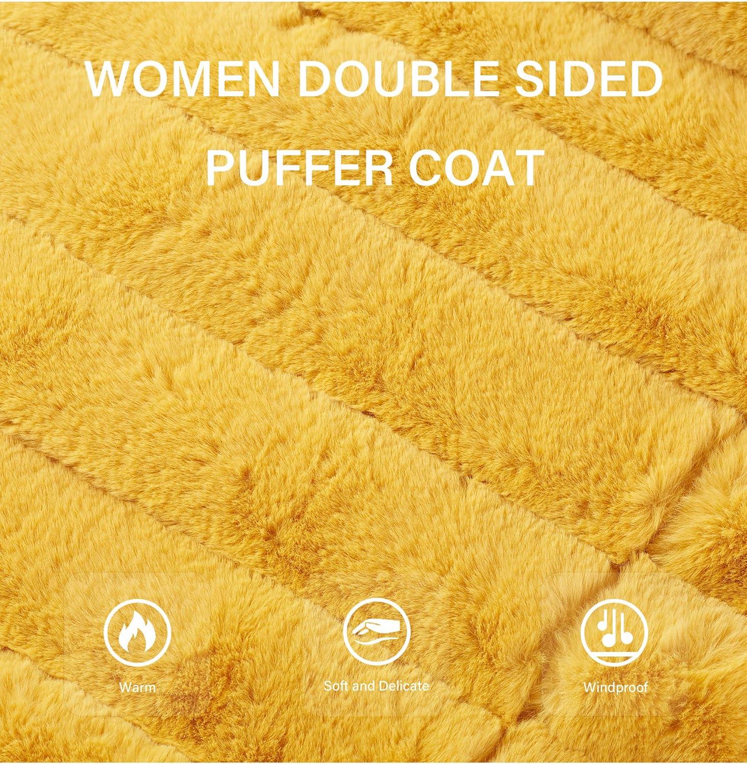 Bellivera Women Double Sided Faux Fur Jacket Spring and Winter Fashion Reversible Hood Puffer Coat with Fur Collar(Yellow)