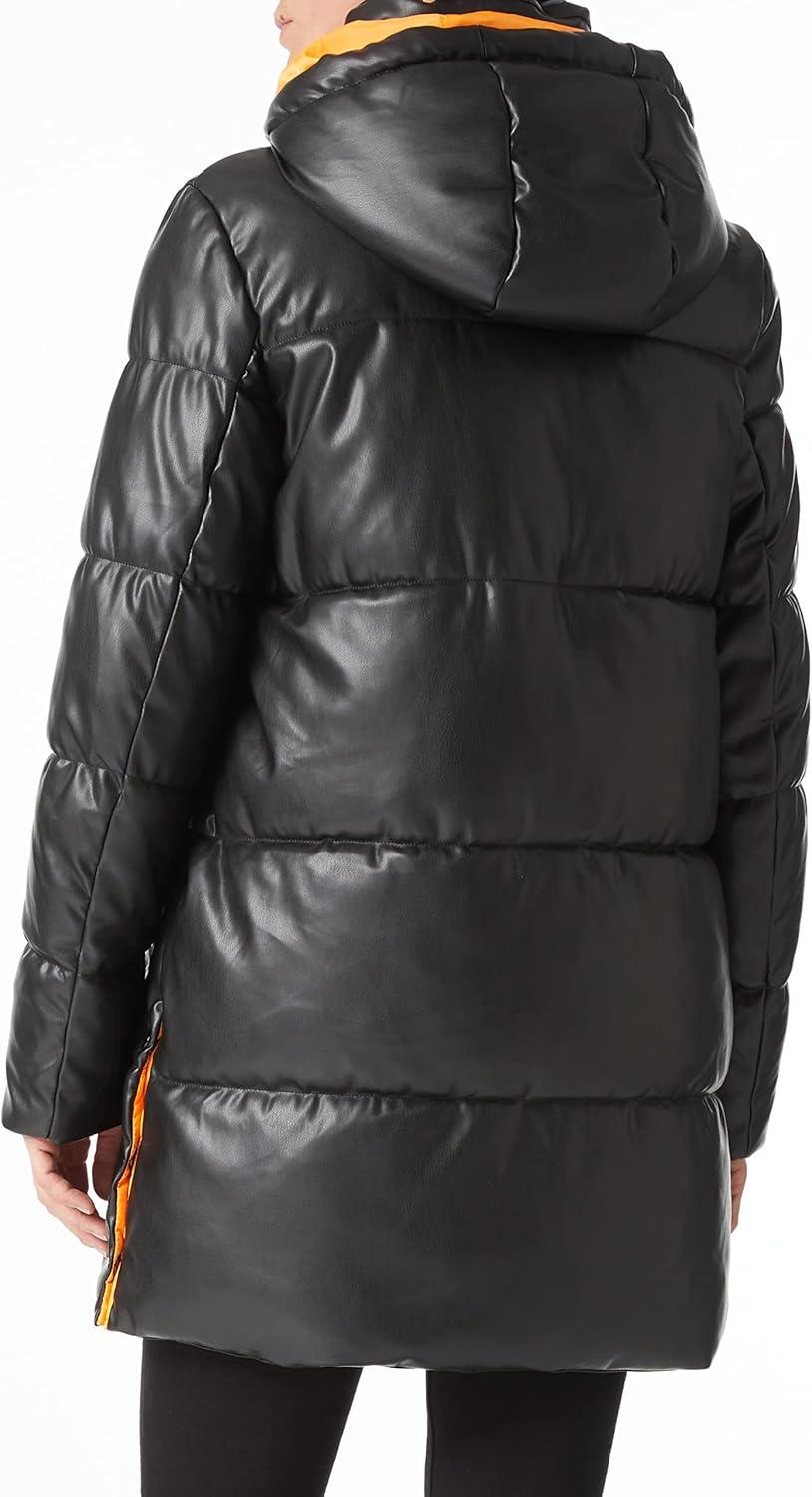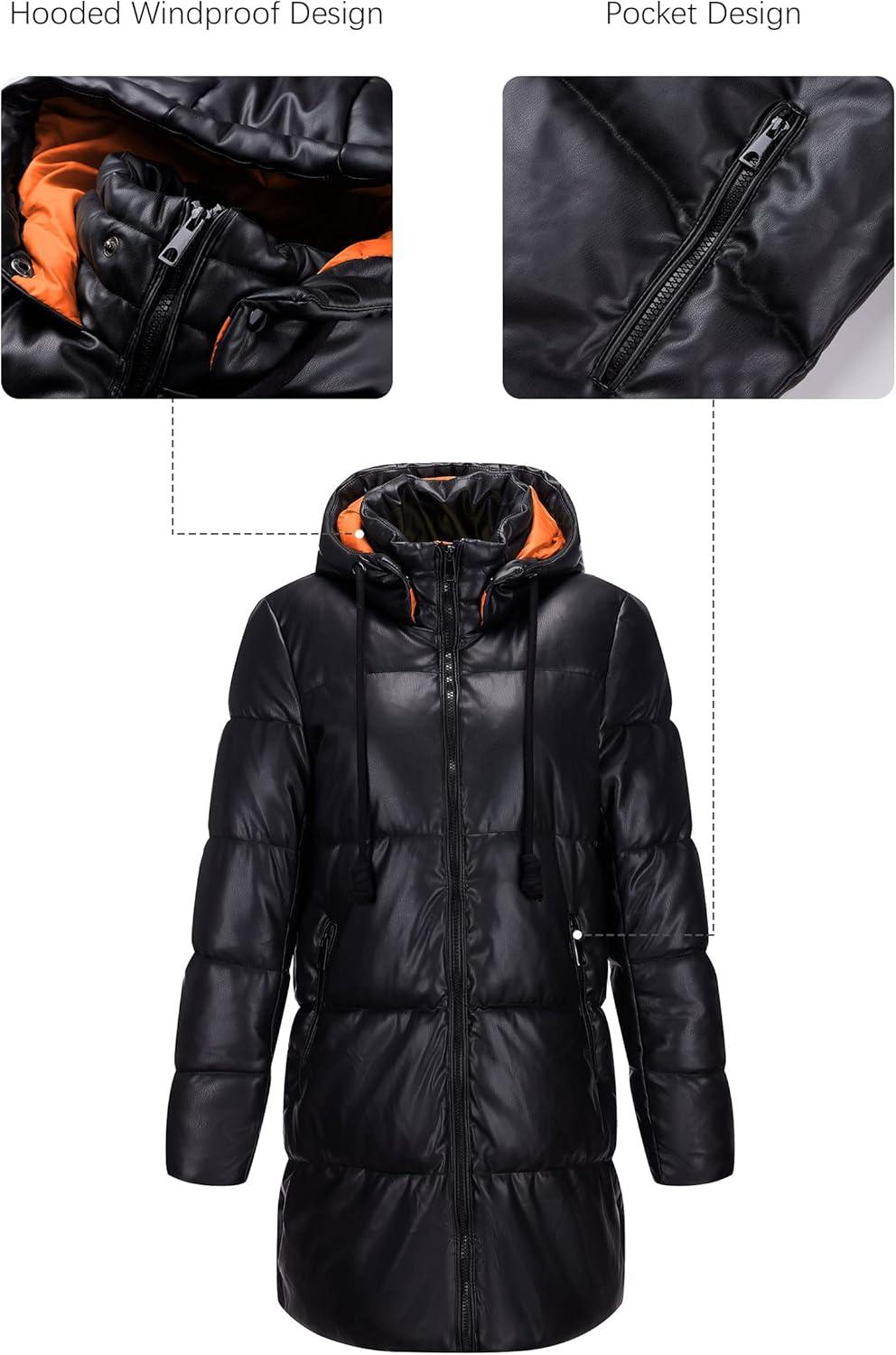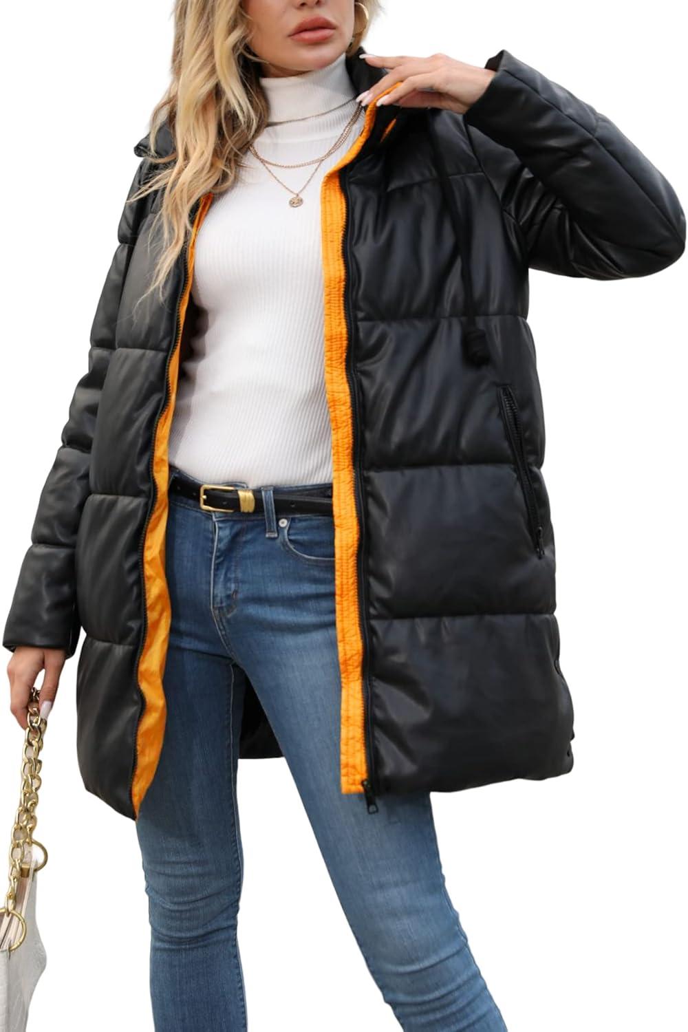 Bellivera Women Faux Leather Jacket Long Quilted Hood Puffer Winter Coat(Blackorange)