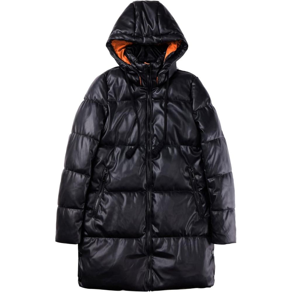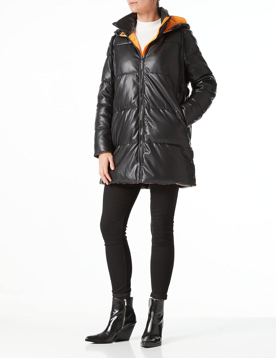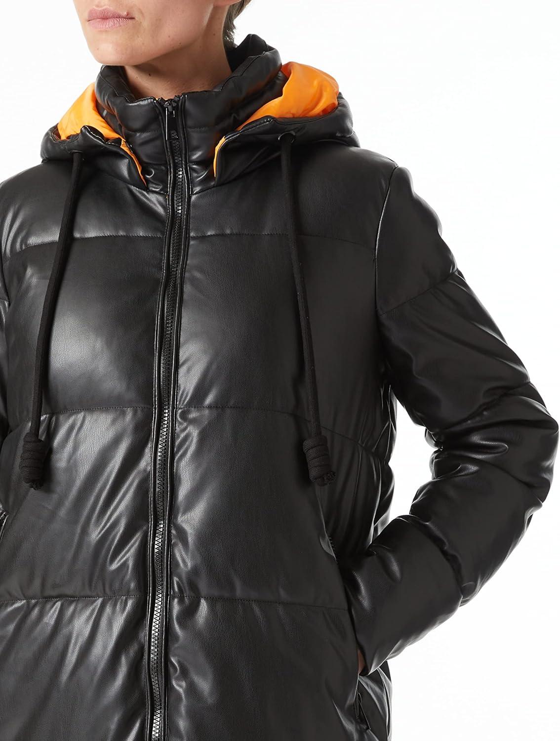 Bellivera Women Faux Leather Jacket Long Quilted Hood Puffer Winter Coat(Blackorange)