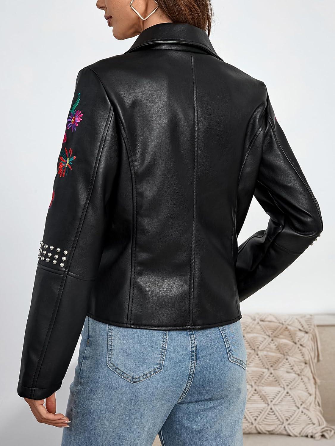 Bellivera Women Faux Leather Jacket Studded Rivet Floral Moto Biker Coat(Black Floral Jacket)
