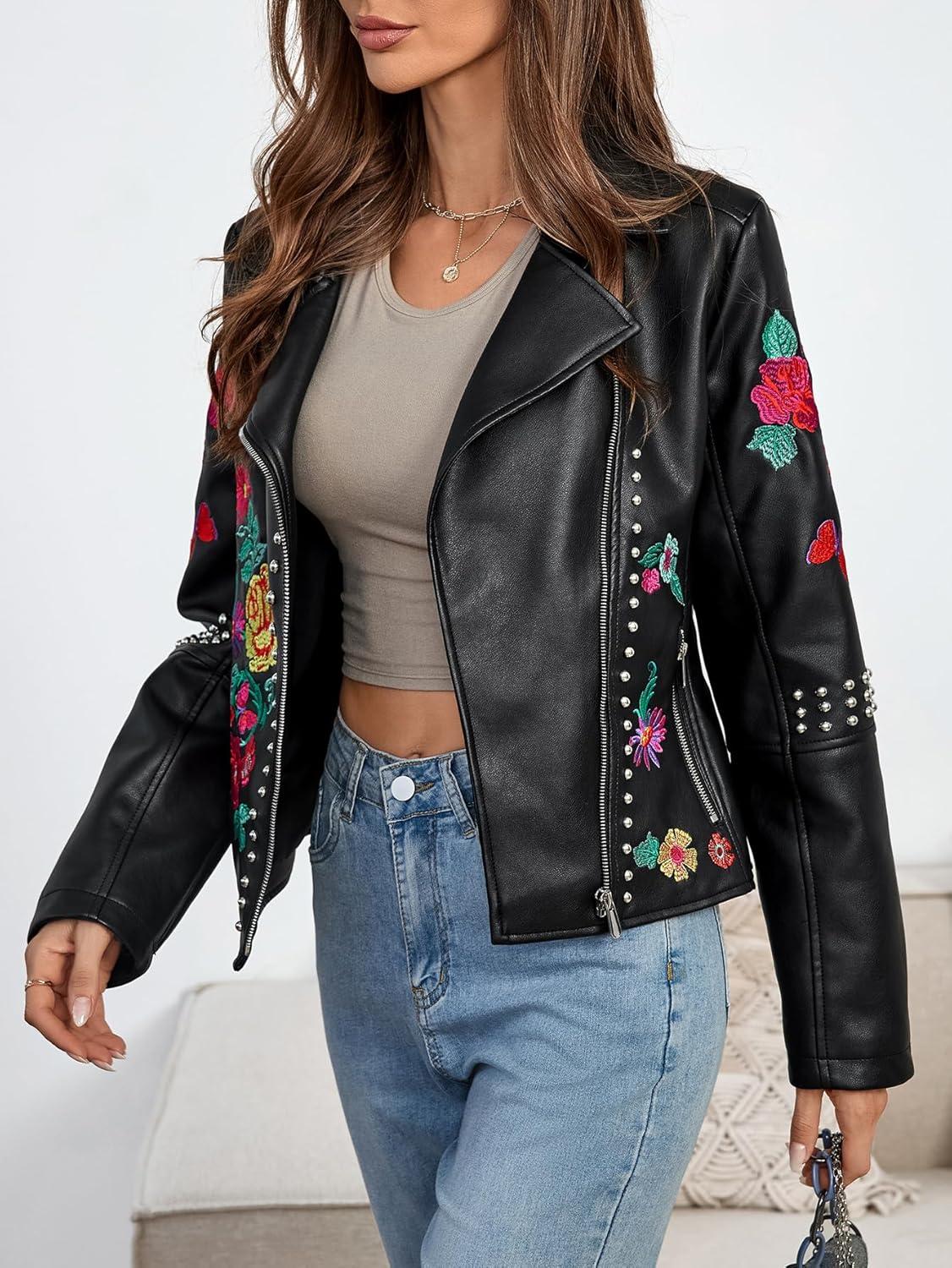 Bellivera Women Faux Leather Jacket Studded Rivet Floral Moto Biker Coat(Brown Embroidered Jacket)