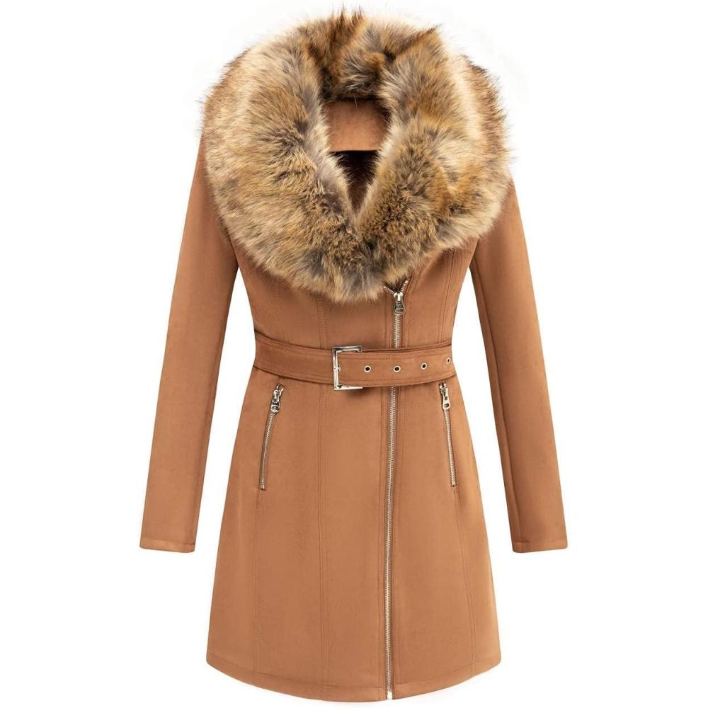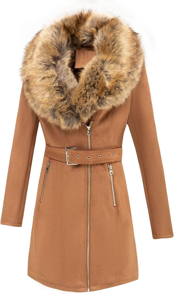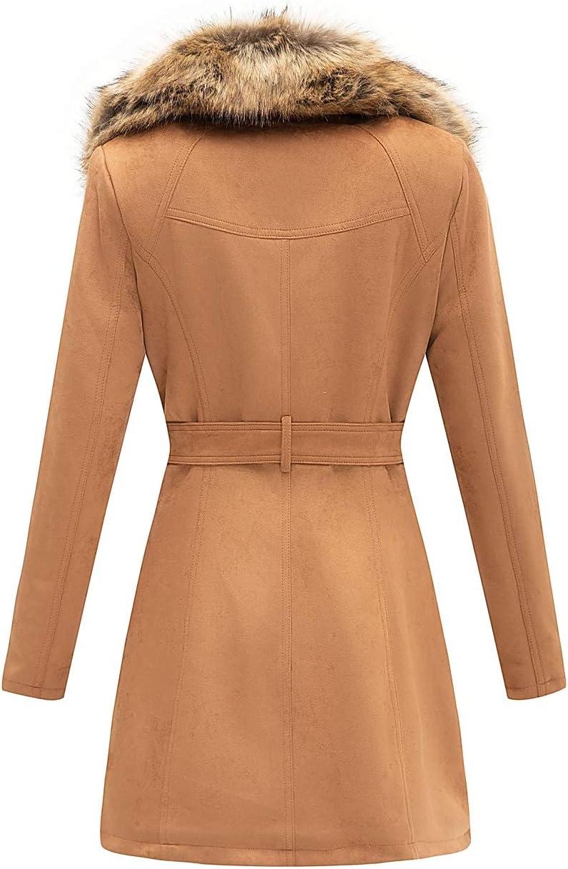 Bellivera Women Faux Leather Trench Coat Fleece-Lined Mid-length Jacket with Detachable Fur Collar(Camel Coat)