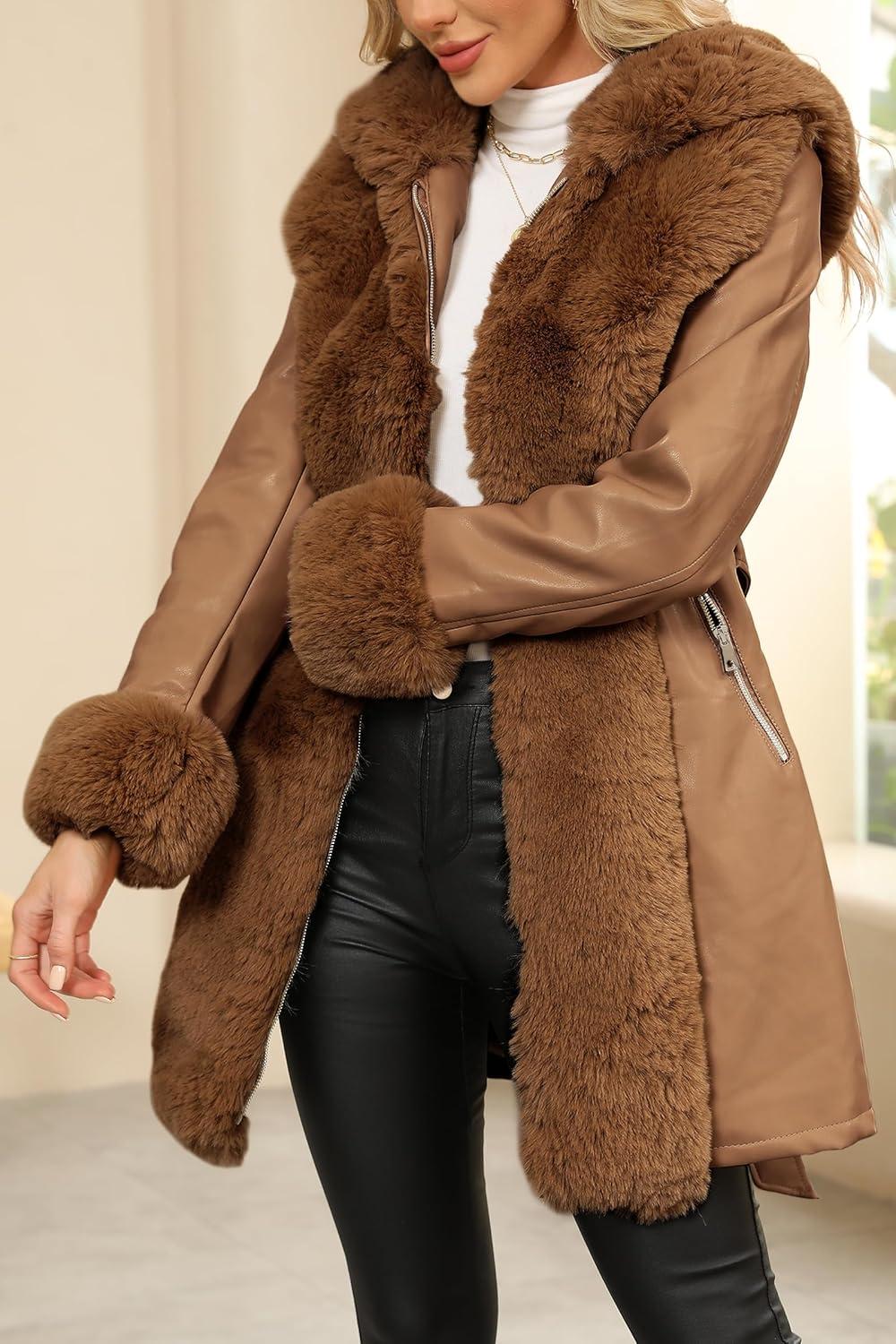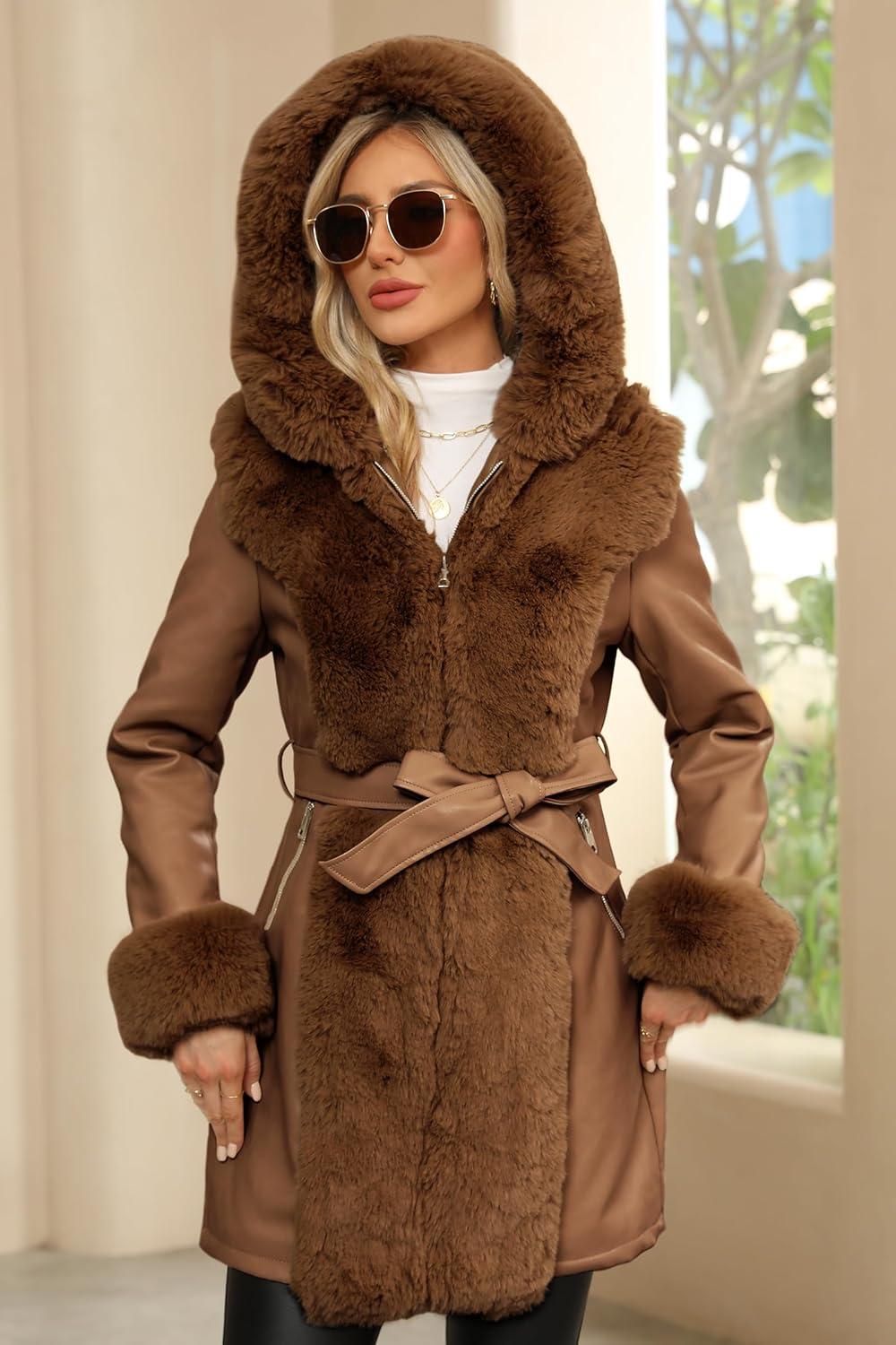 Bellivera Women Faux Leather Winter Trendy Puffer Jacket Water-resistant Thicken Bubble Coat with Fur Collar and Belt(Brown)