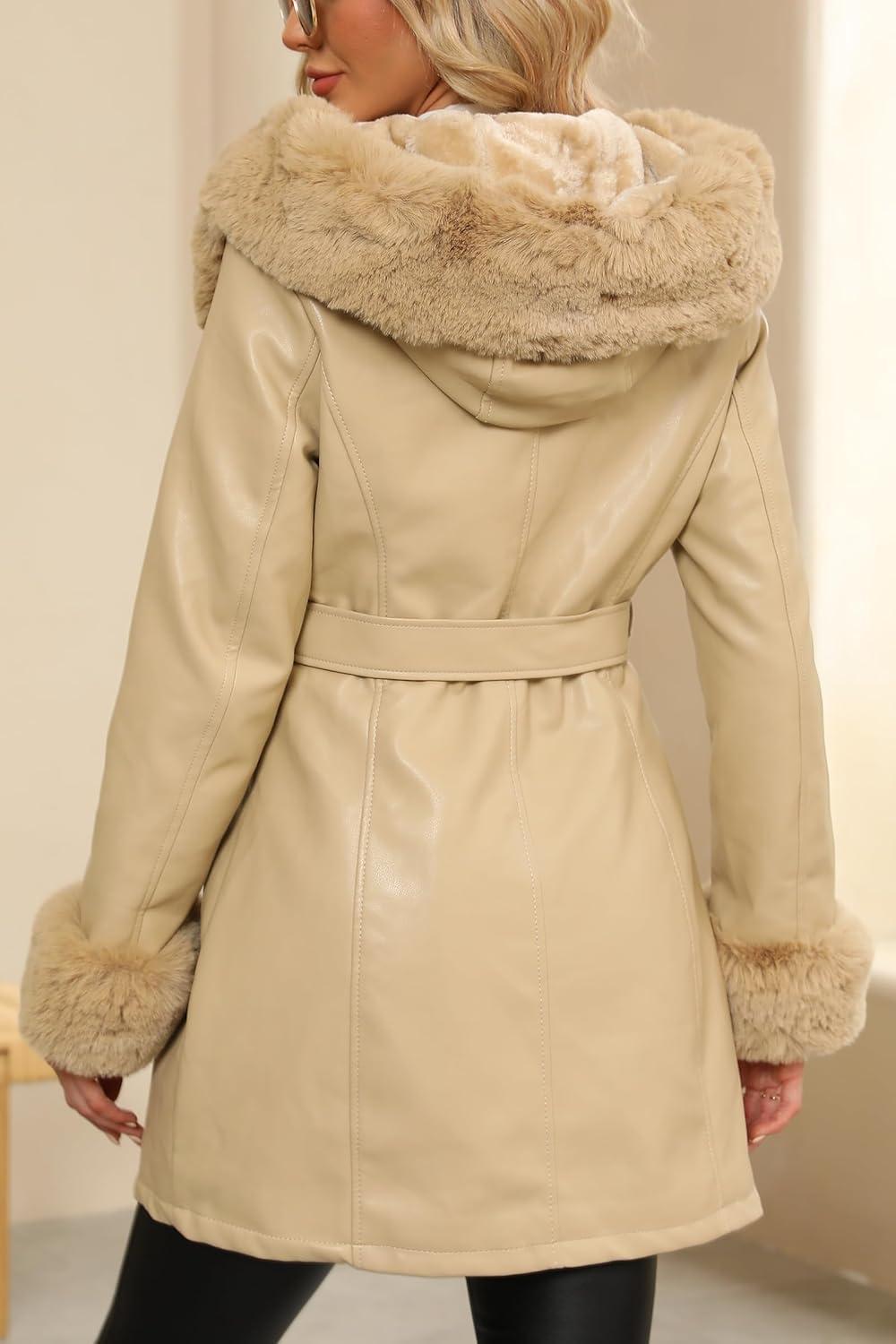 Bellivera Women Faux Leather Winter Trendy Puffer Jacket Water-resistant Thicken Bubble Coat with Fur Collar and Belt(Khaki Fur)
