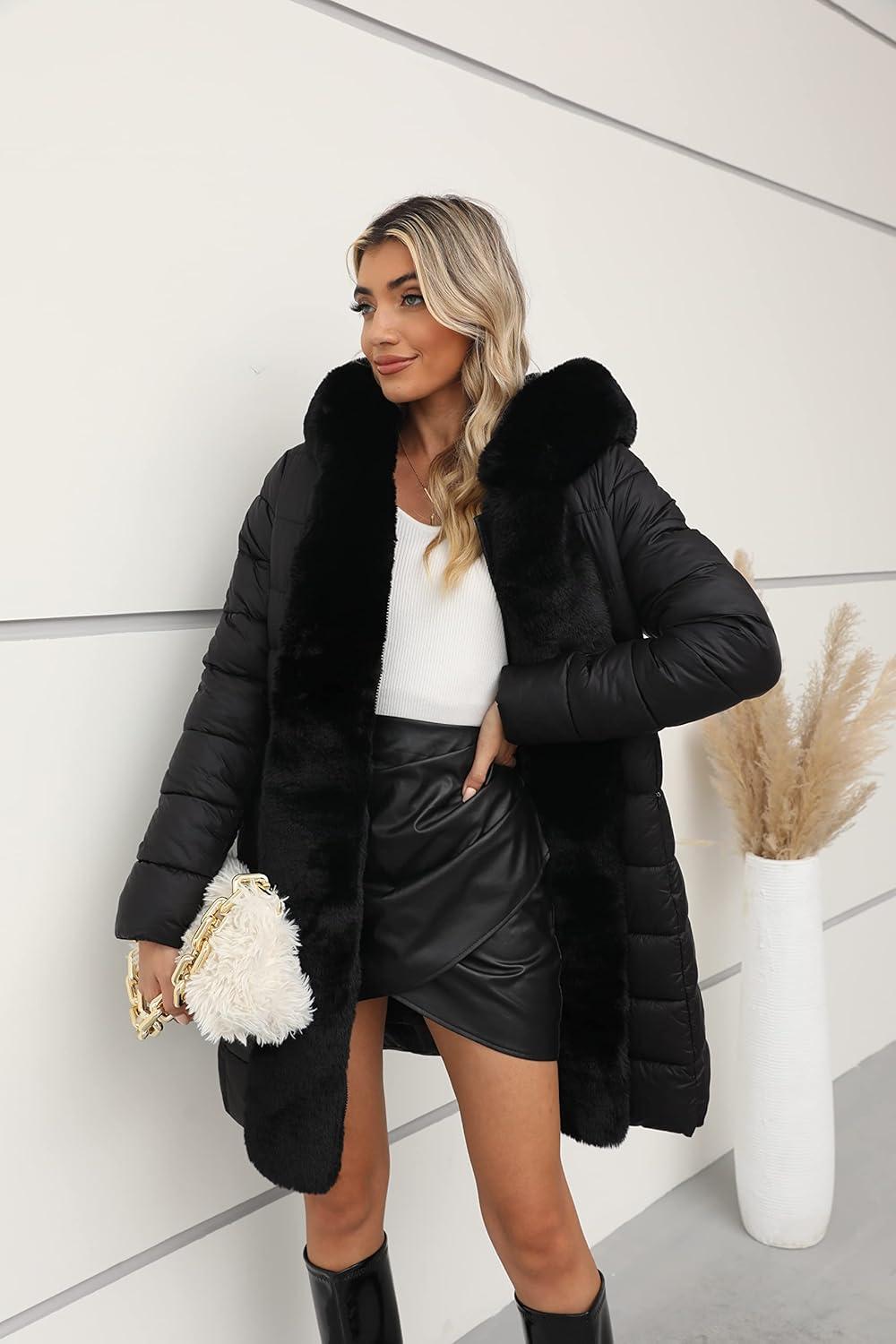 Bellivera Women Faux Leather Winter Trendy puffer jacket water-resistant Thicken Bubble Coat with Fur Hood and Belt(Black)