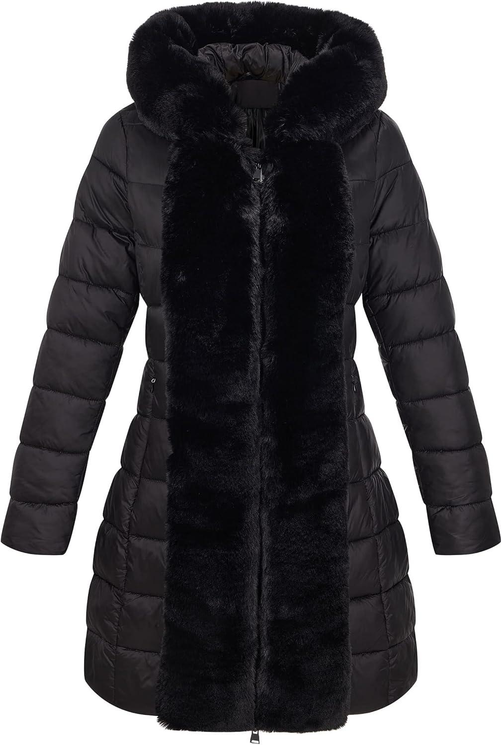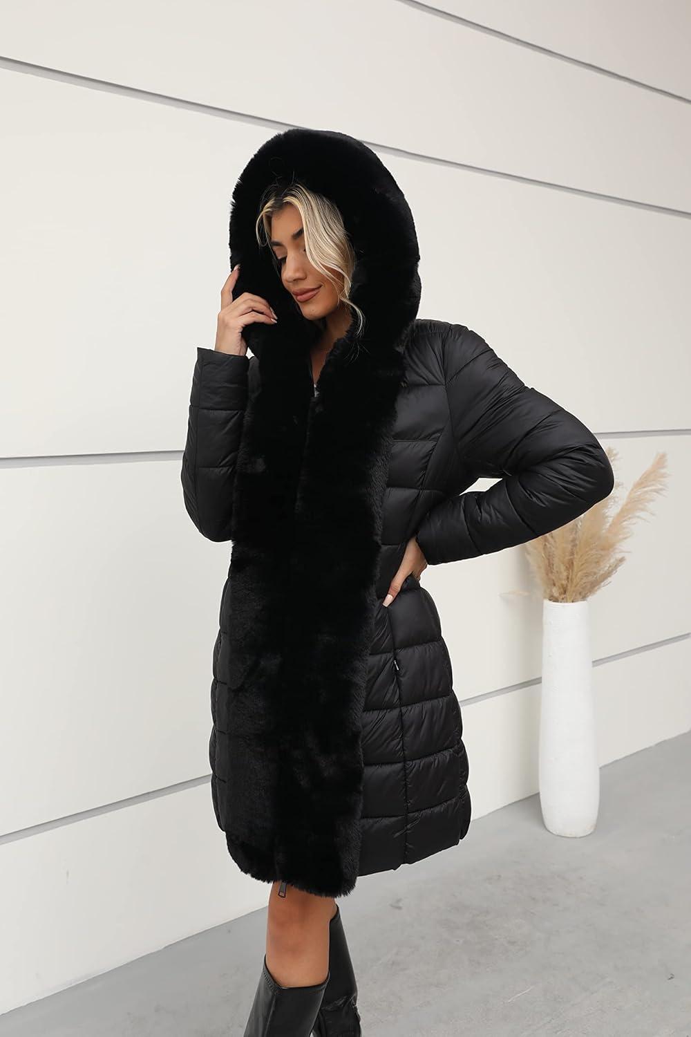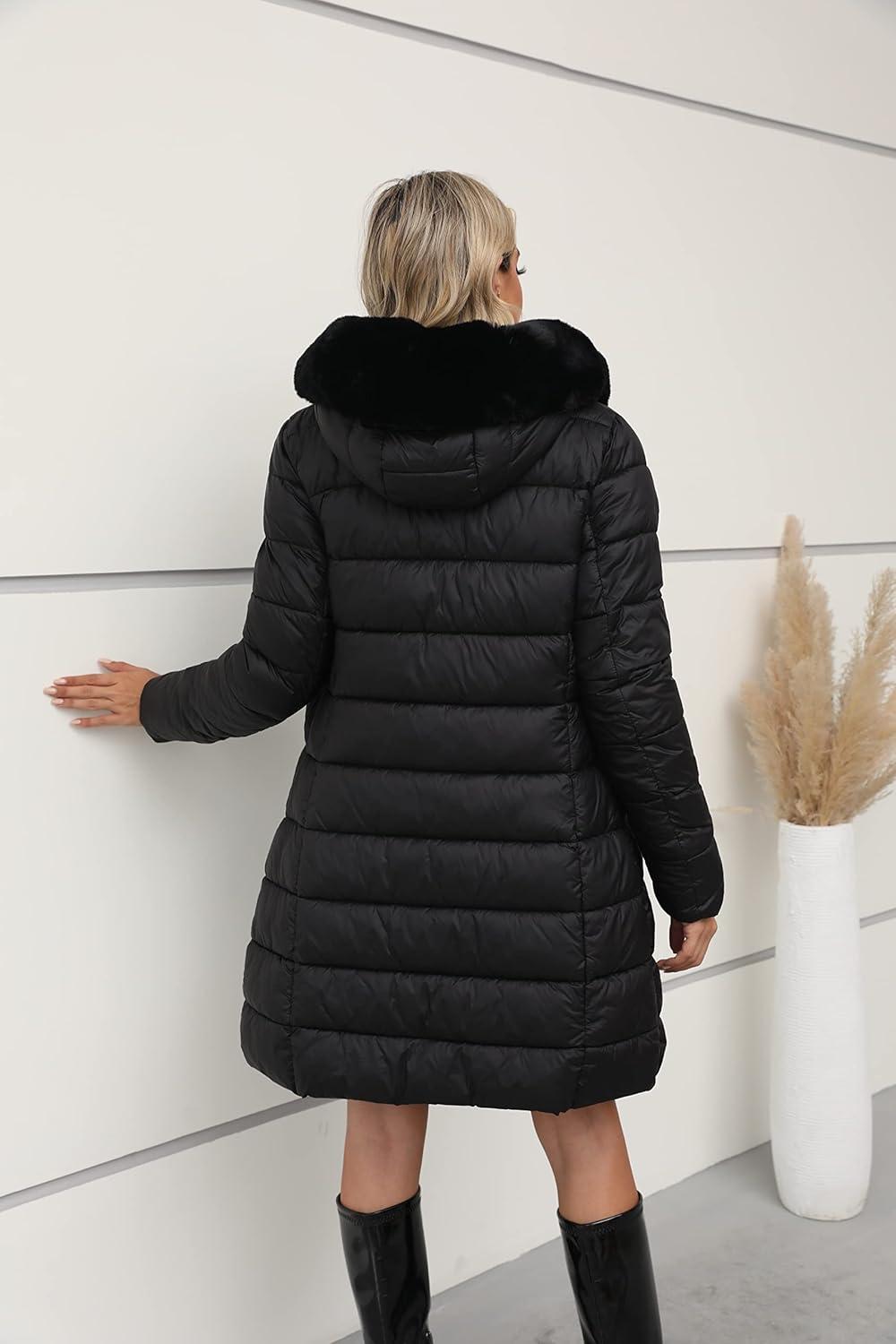 Bellivera Women Faux Leather Winter Trendy puffer jacket water-resistant Thicken Bubble Coat with Fur Hood and Belt(Coal Black)