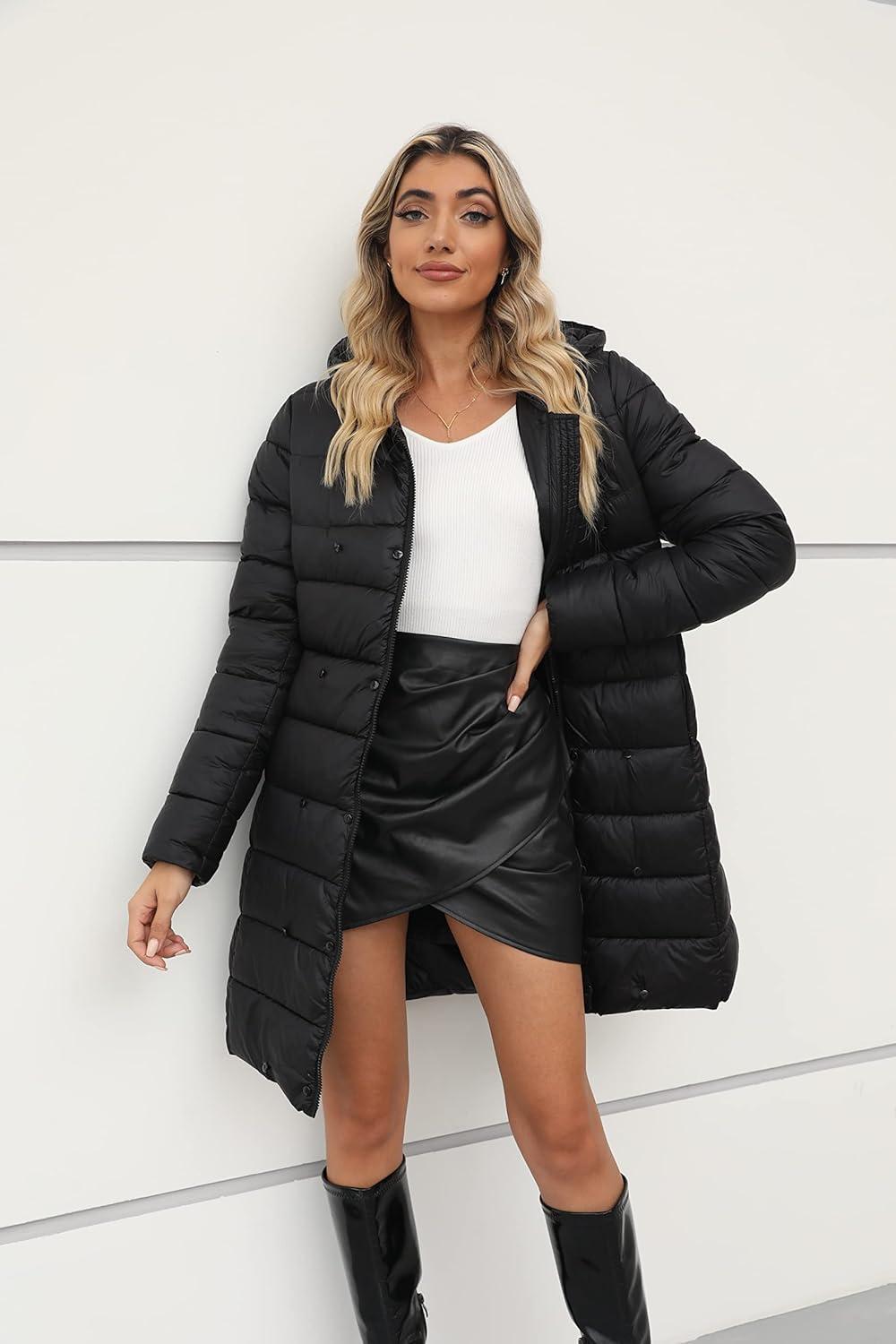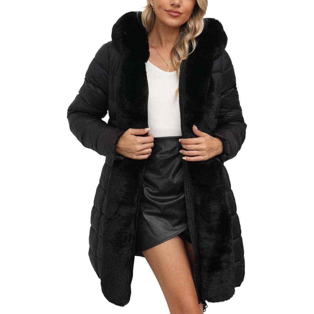 imageBellivera Women Faux Leather Winter Trendy puffer jacket waterresistant Thicken Bubble Coat with Fur Hood and BeltBlack