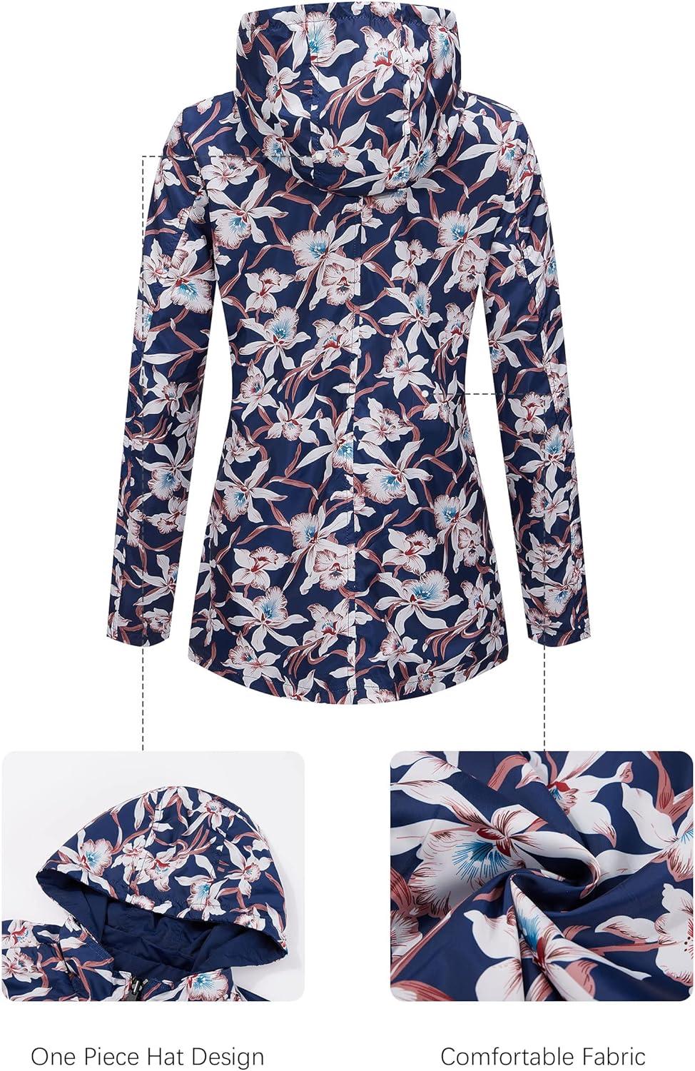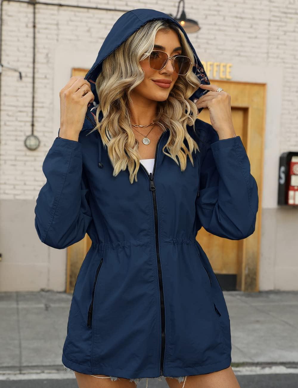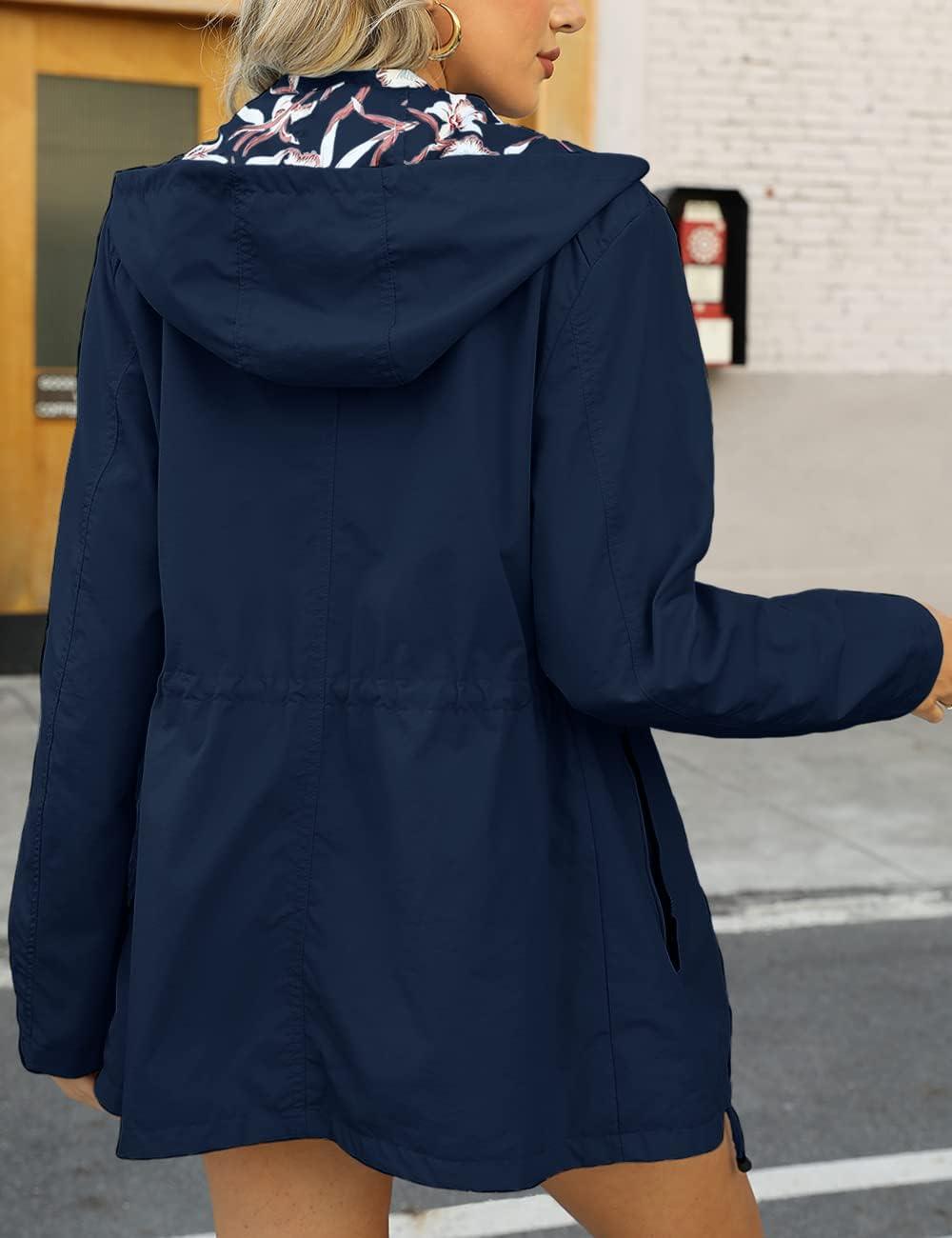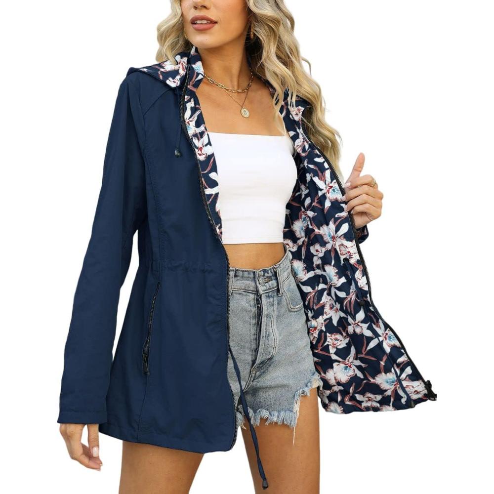 Bellivera Women Reversible Lightweight Jacket Casual Windbreaker Outerwear Waterproof Outdoor Printed Raincoat(Blue)