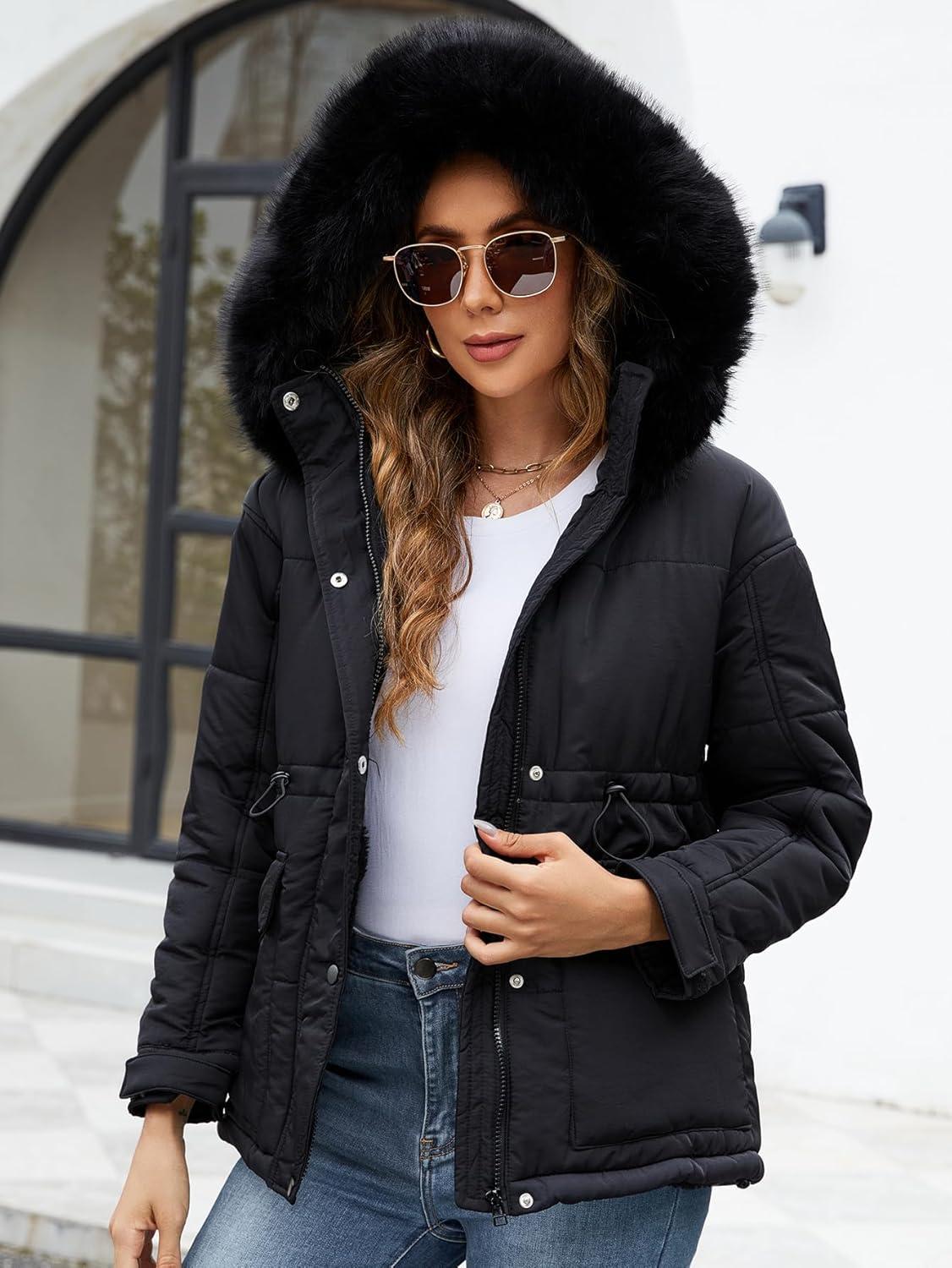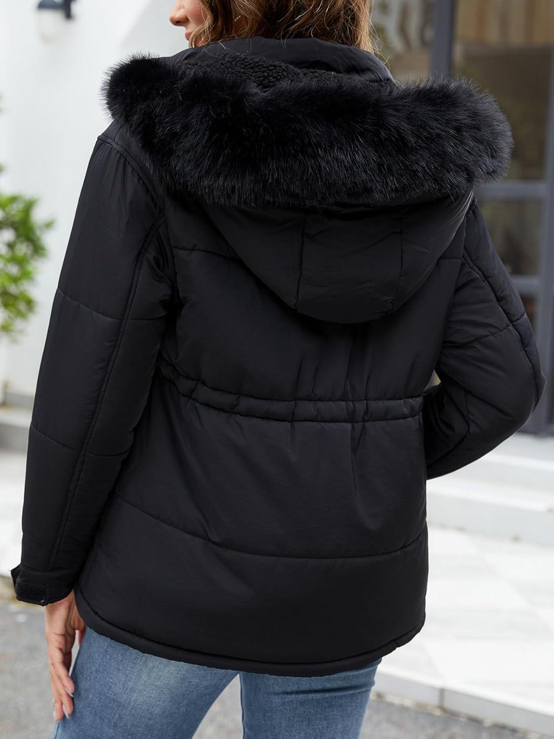 Bellivera Women Twill Parka Jacket Winter Trendy Warm Hood Coat with Faux Fur Collar(Black)