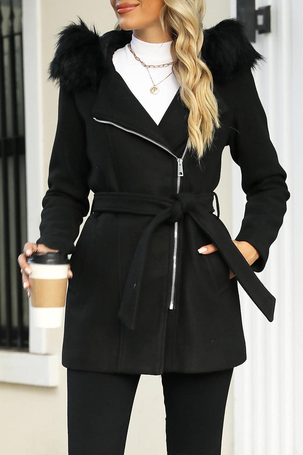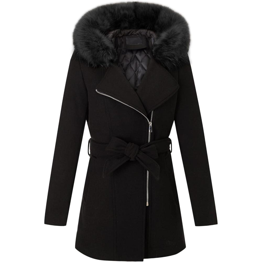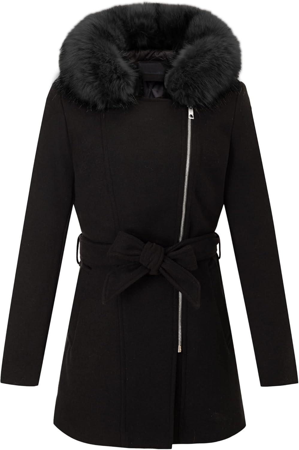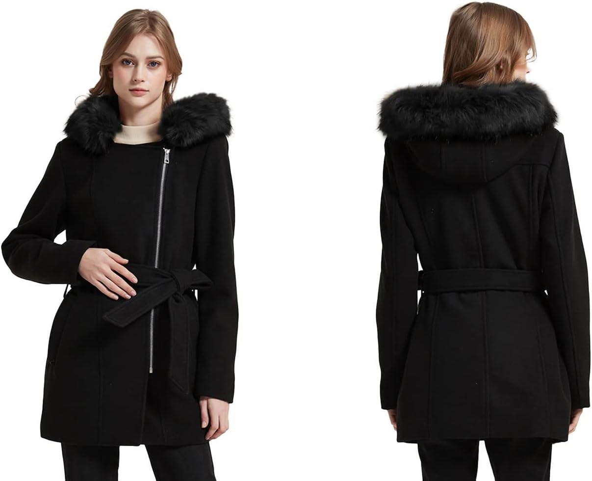 Bellivera Women Wool Jacket Blend Winter Mid Long Trench Coat Warm Pea Overcoat(Black With Collar Coat)