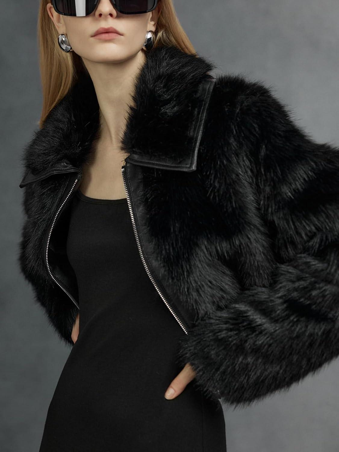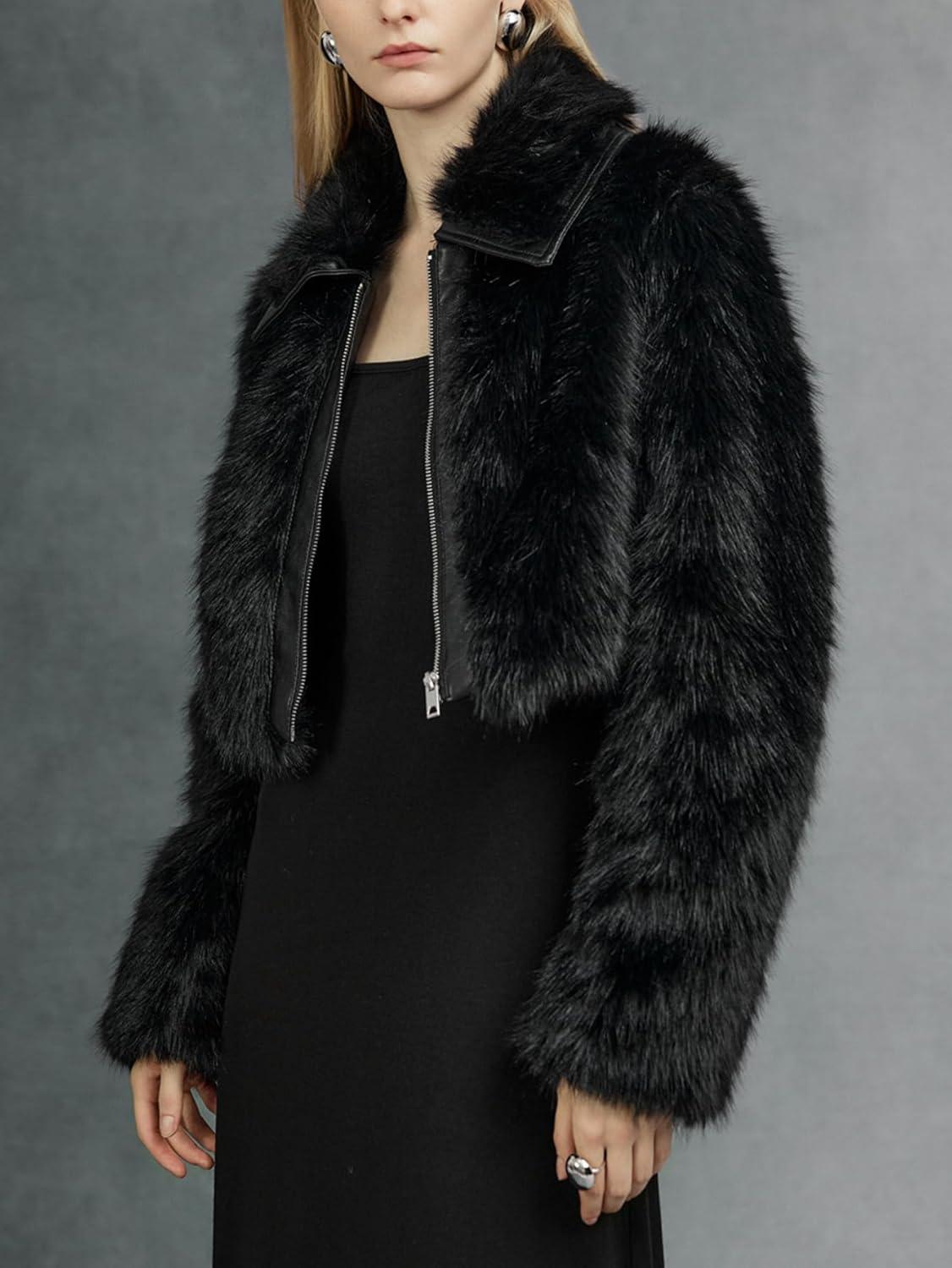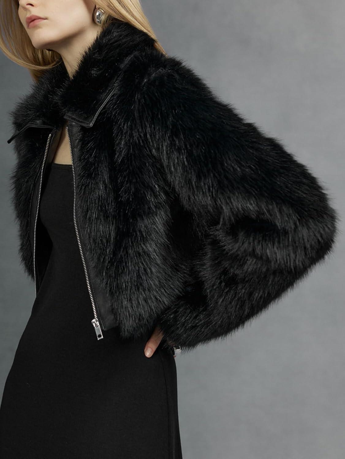 Bellivera Womens Faux Fur Leather Jacket Fleece Cropped Warm Fluffy Coat Soft Zip Outerwear(Pure Black Crop)