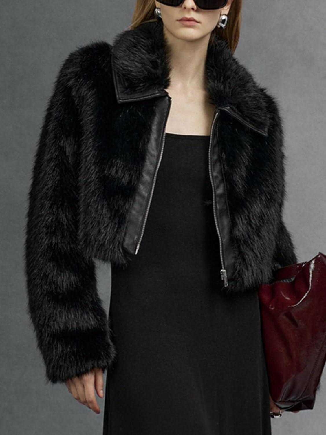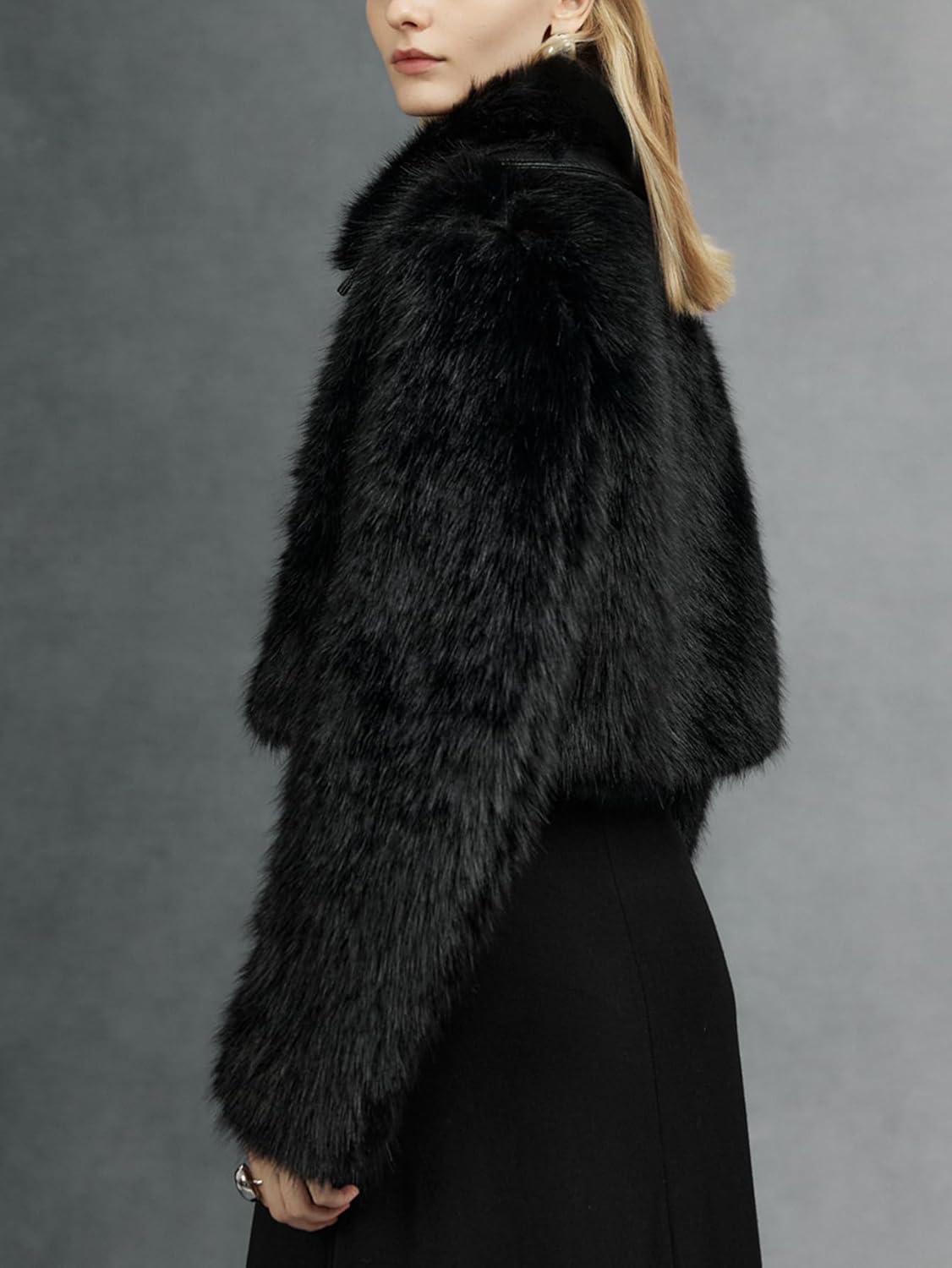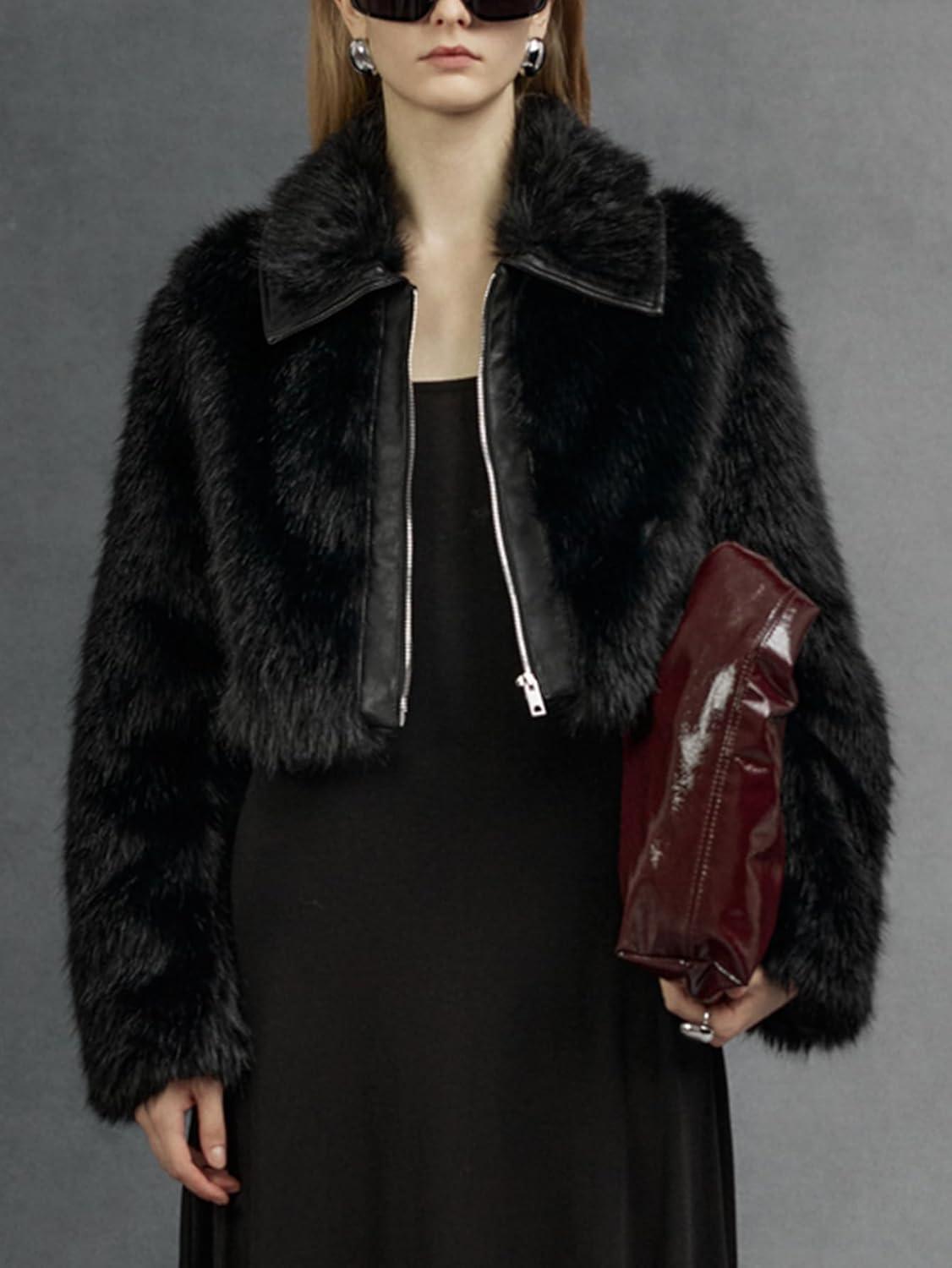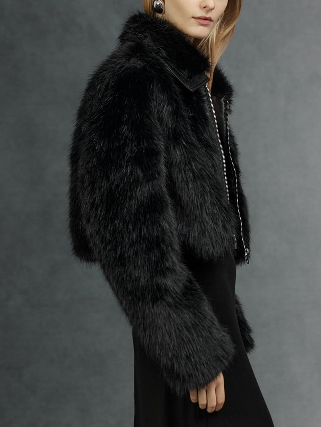 Bellivera Womens Faux Fur Leather Jacket Fleece Cropped Warm Fluffy Coat Soft Zip Outerwear(Pure Black Crop)