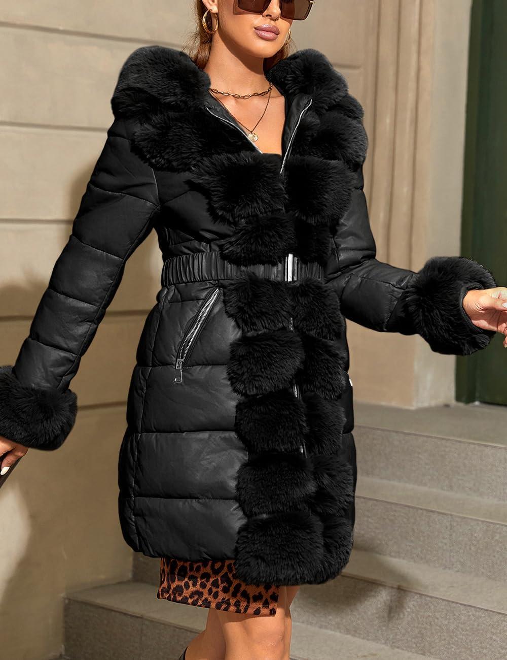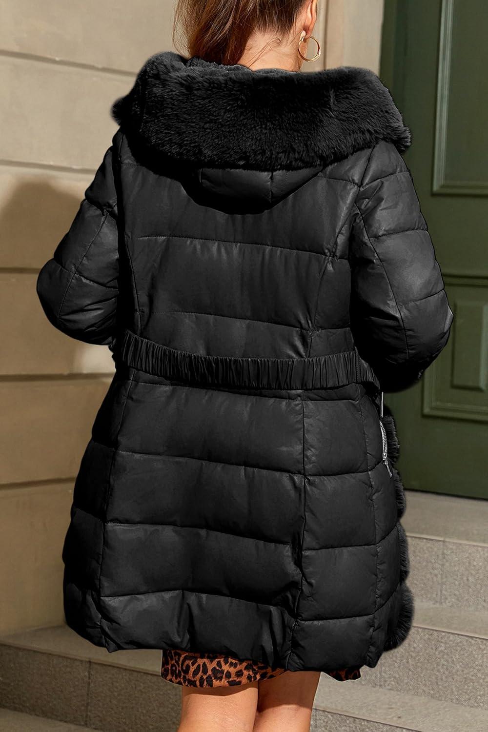 Bellivera Women’s Faux Leather Fleece Lined Coat Winter Hooded Zip-up Parka with Belt(Black)