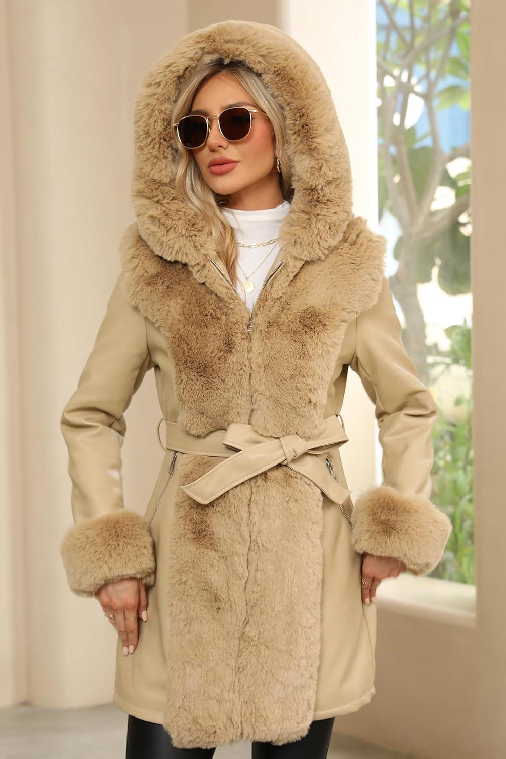 Bellivera Women’s Faux Leather Fleece Lined Coat Winter Hooded Zip-up Parka with Belt(Khaki Fur)