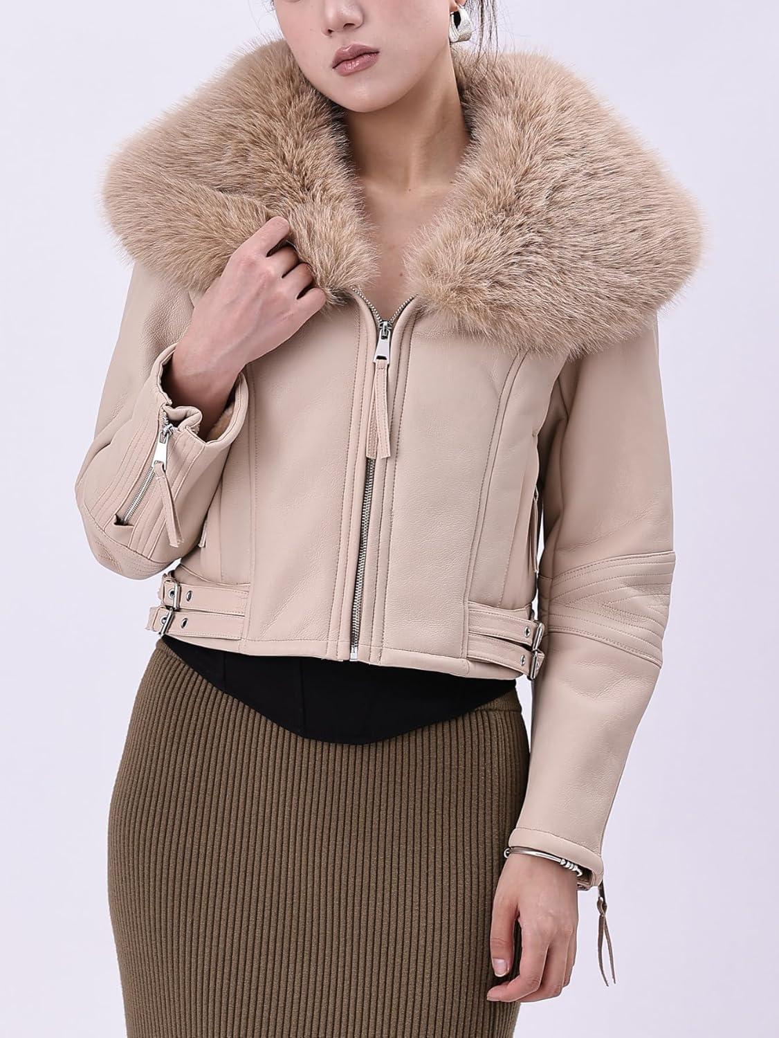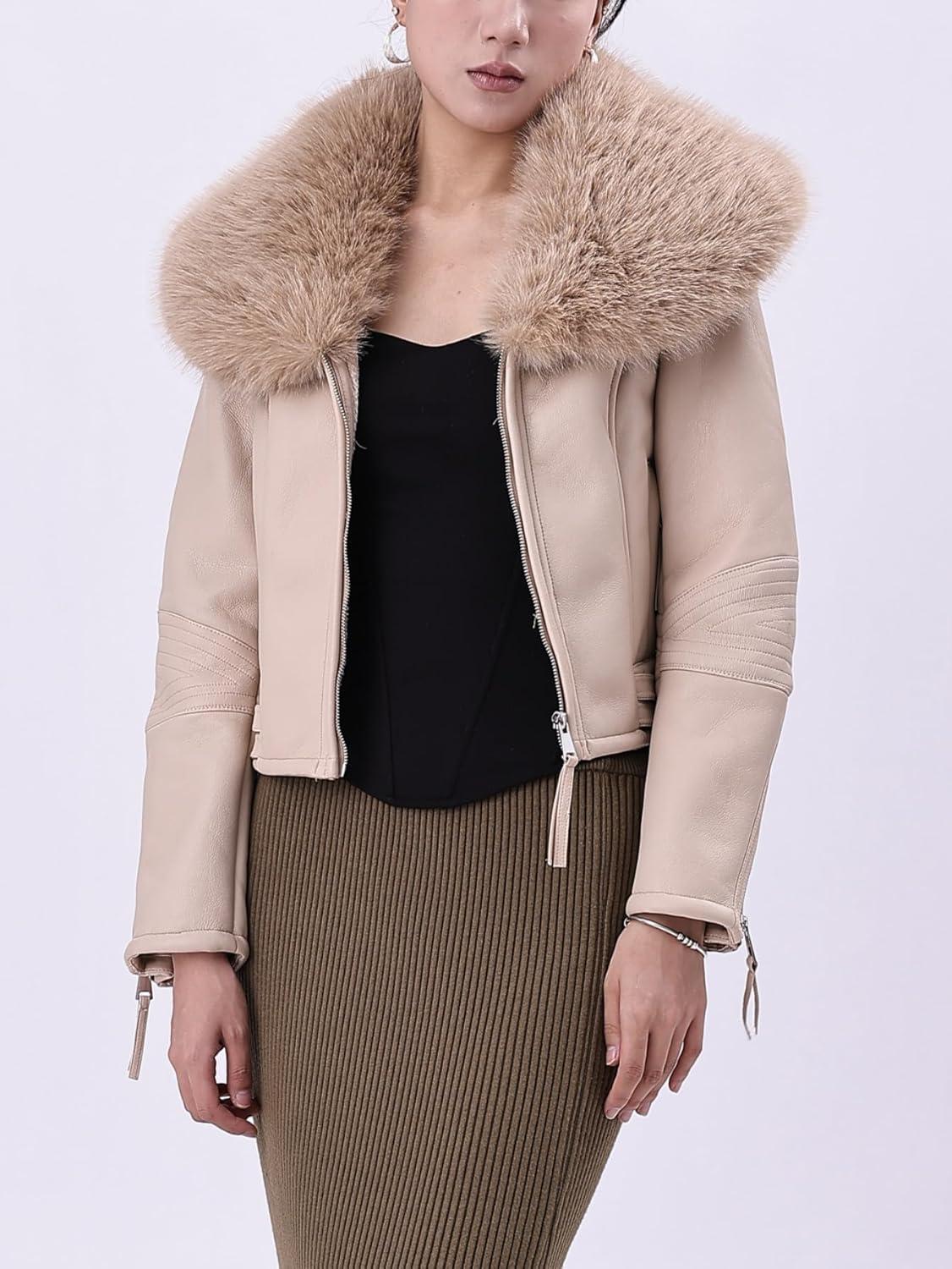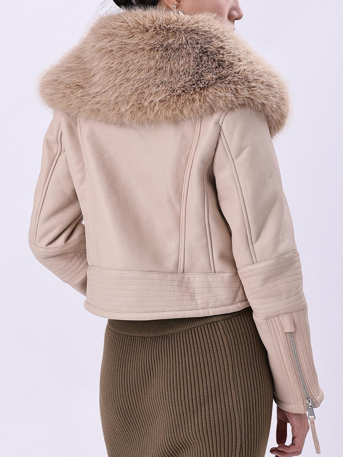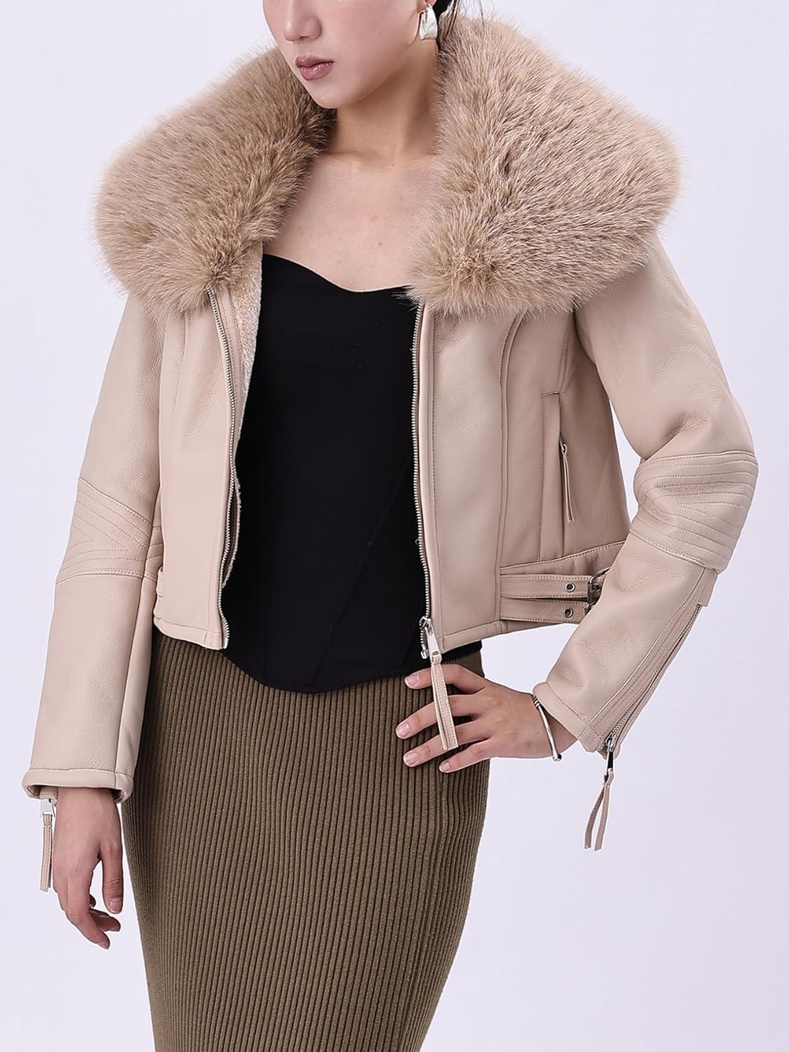 Bellivera Women’s Faux Leather Jacket Moto Biker Sherpa-Lined Coat with Removable Fur Collar(Beige Suede)