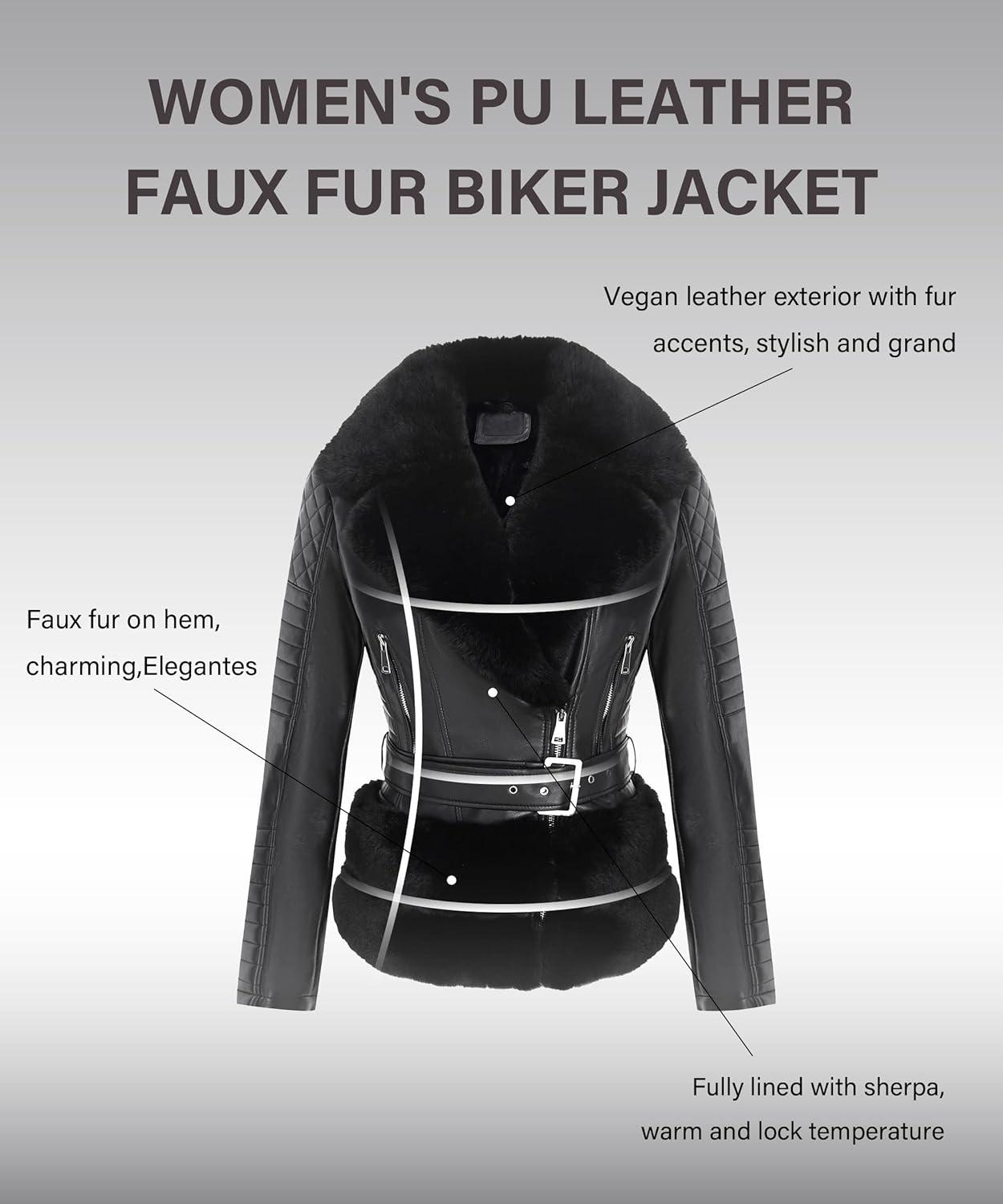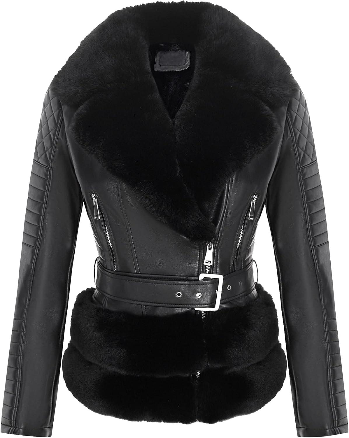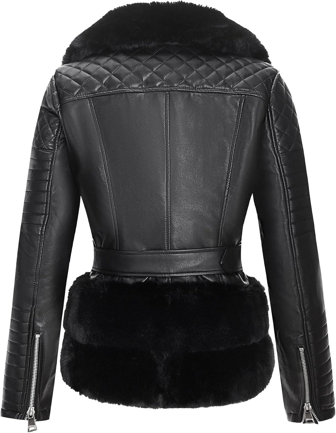 Bellivera Women’s Faux Leather Jacket Moto Biker Sherpa-Lined Coat with Removable Fur Collar(Black Belt)