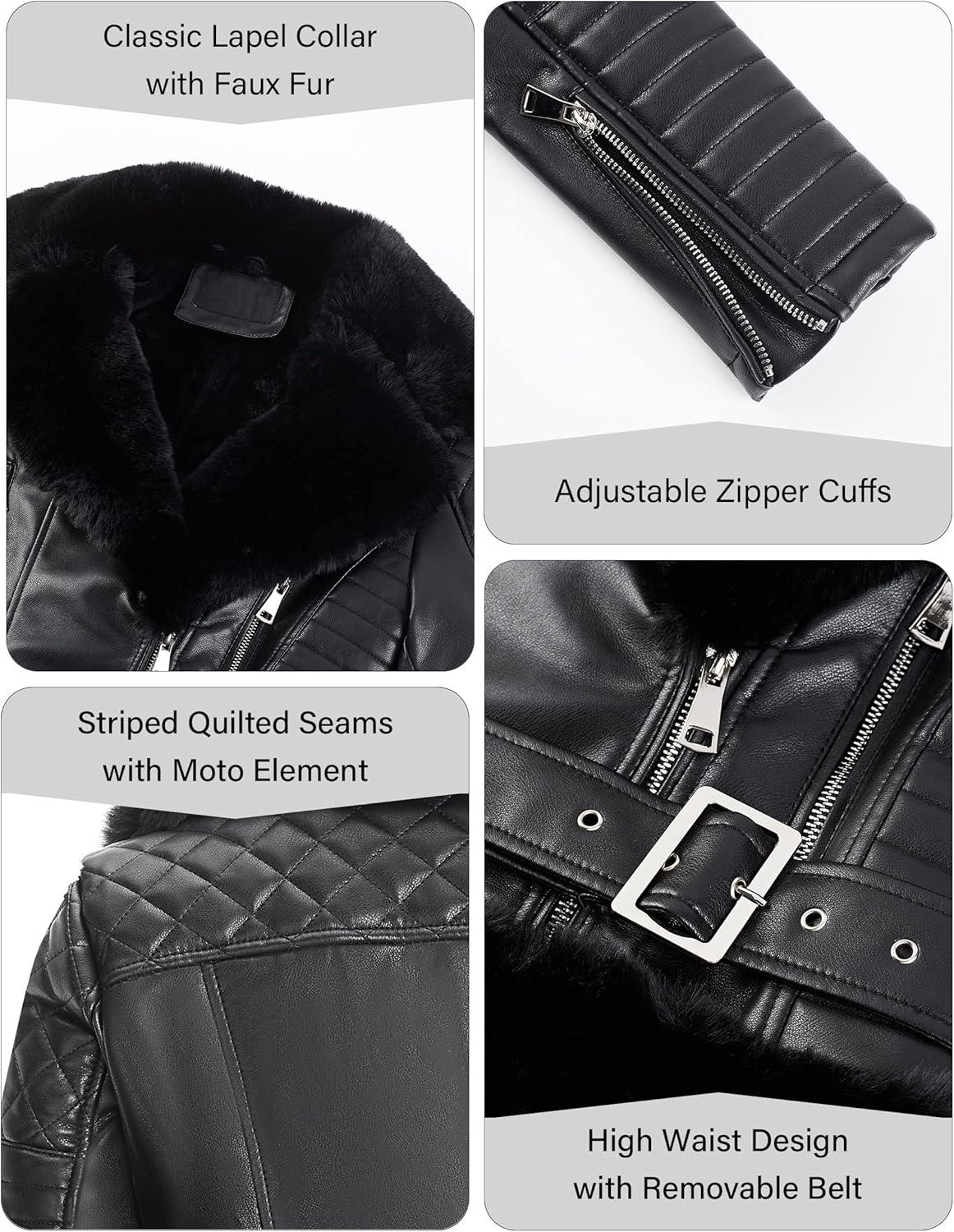 Bellivera Women’s Faux Leather Jacket Moto Biker Sherpa-Lined Coat with Removable Fur Collar(Black Leather Belt)