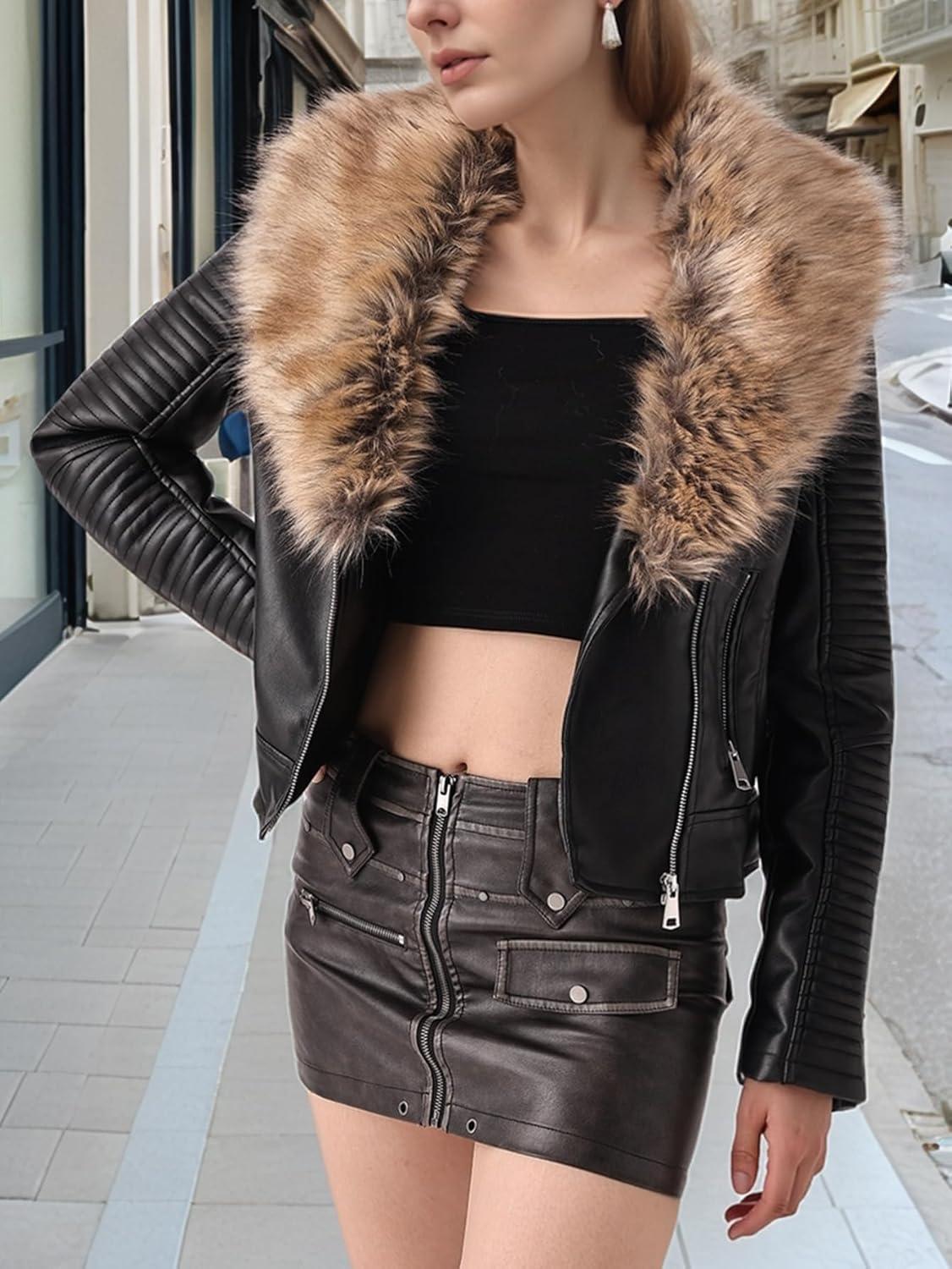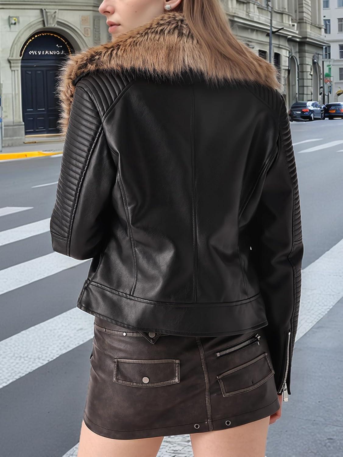 Bellivera Women’s Faux Leather Jacket Moto Biker Sherpa-Lined Coat with Removable Fur Collar(Black Leather Short Jacket)