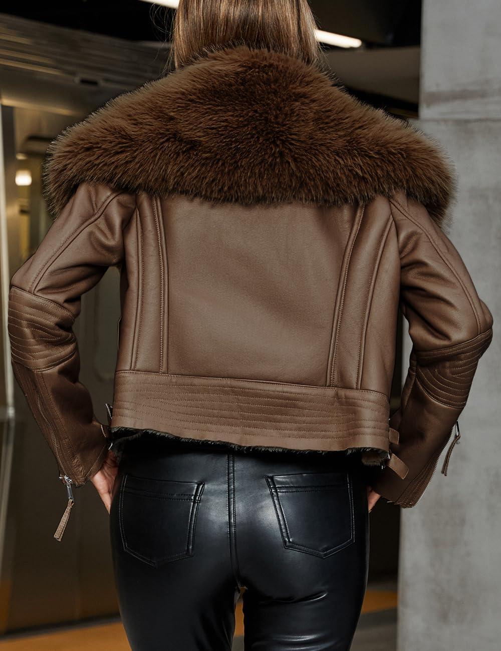 Bellivera Women’s Faux Leather Jacket Moto Biker Sherpa-Lined Coat with Removable Fur Collar(Camel Suede)