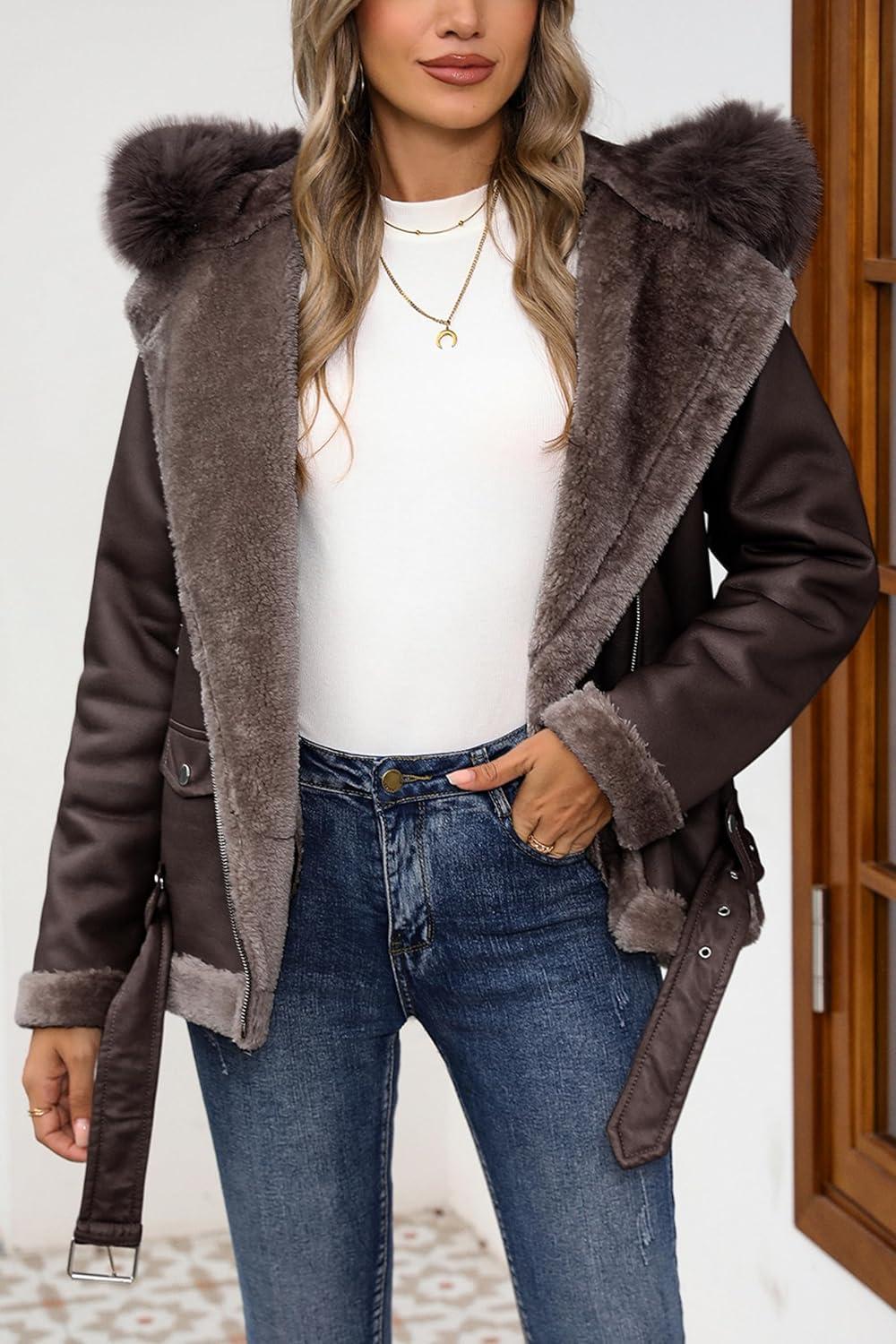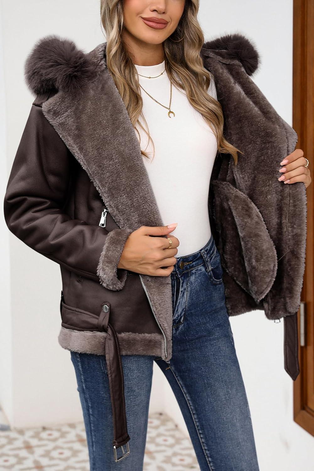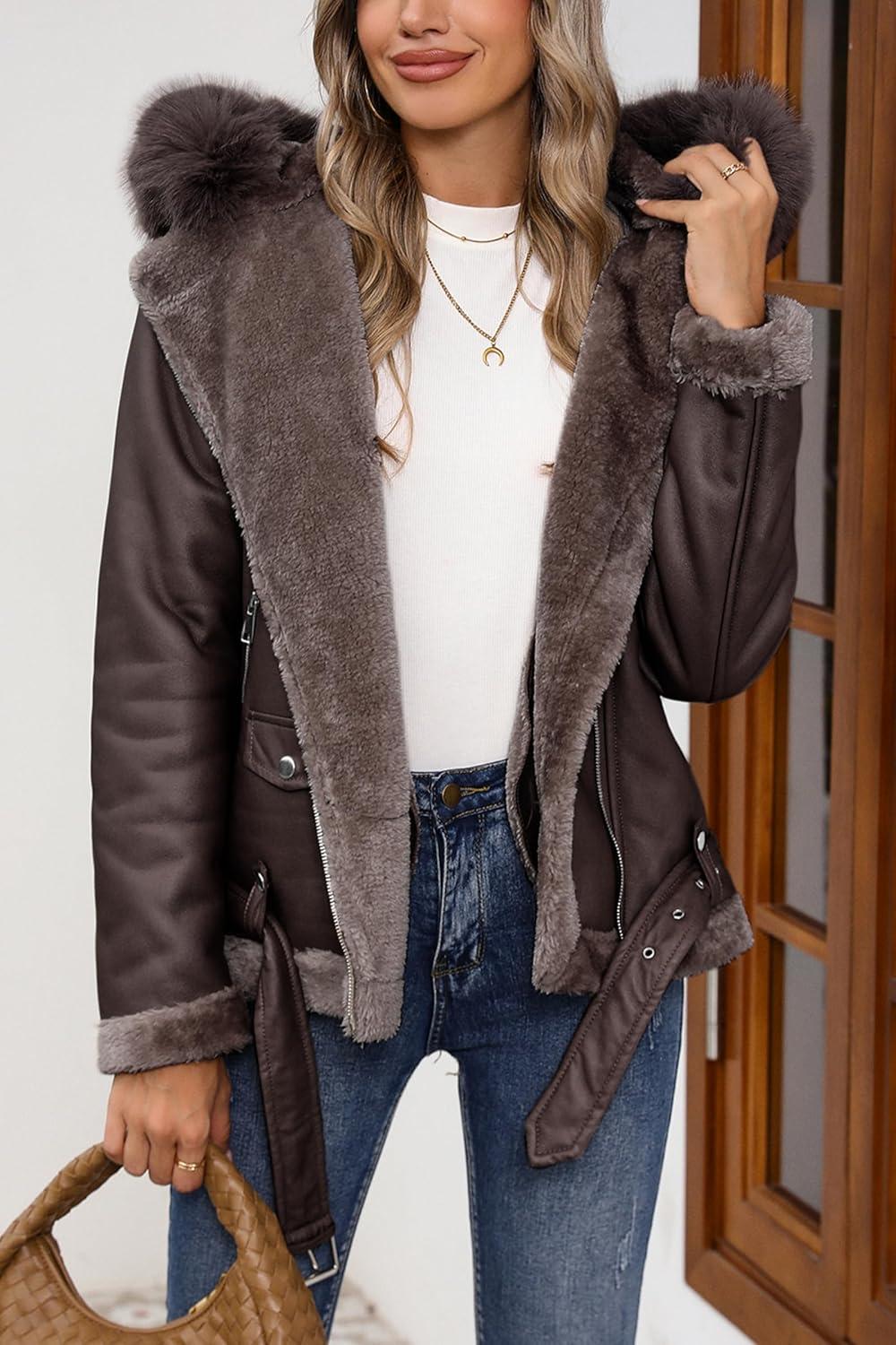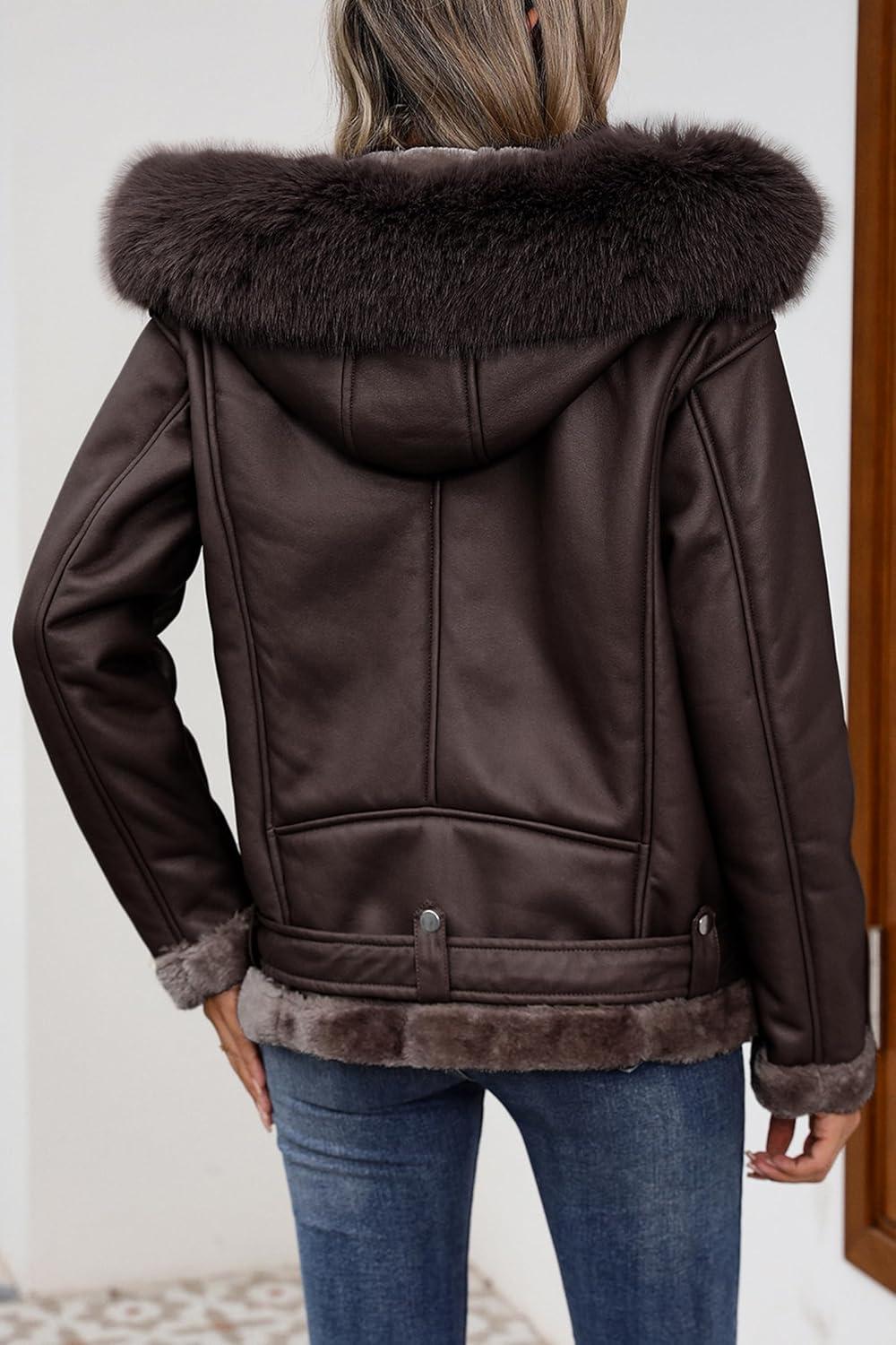 Bellivera Women’s Faux Leather Jacket Moto Biker Sherpa-Lined Coat with Removable Fur Collar(Coffee Shearling Lined)