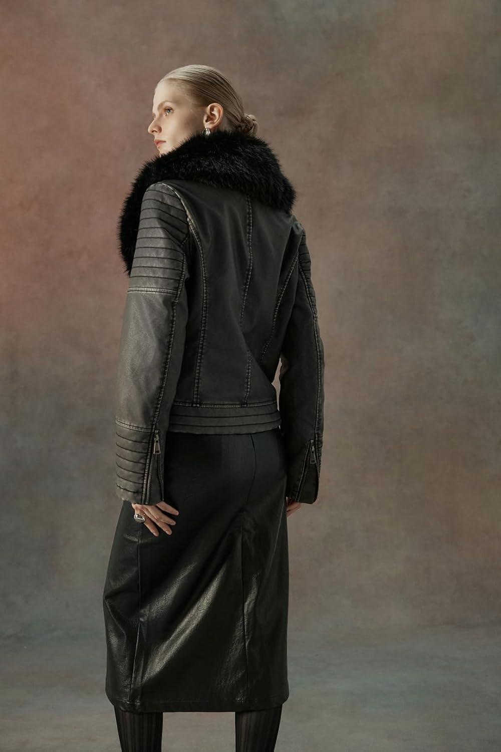Bellivera Women’s Faux Leather Jacket Moto Biker Sherpa-Lined Coat with Removable Fur Collar(Grey)