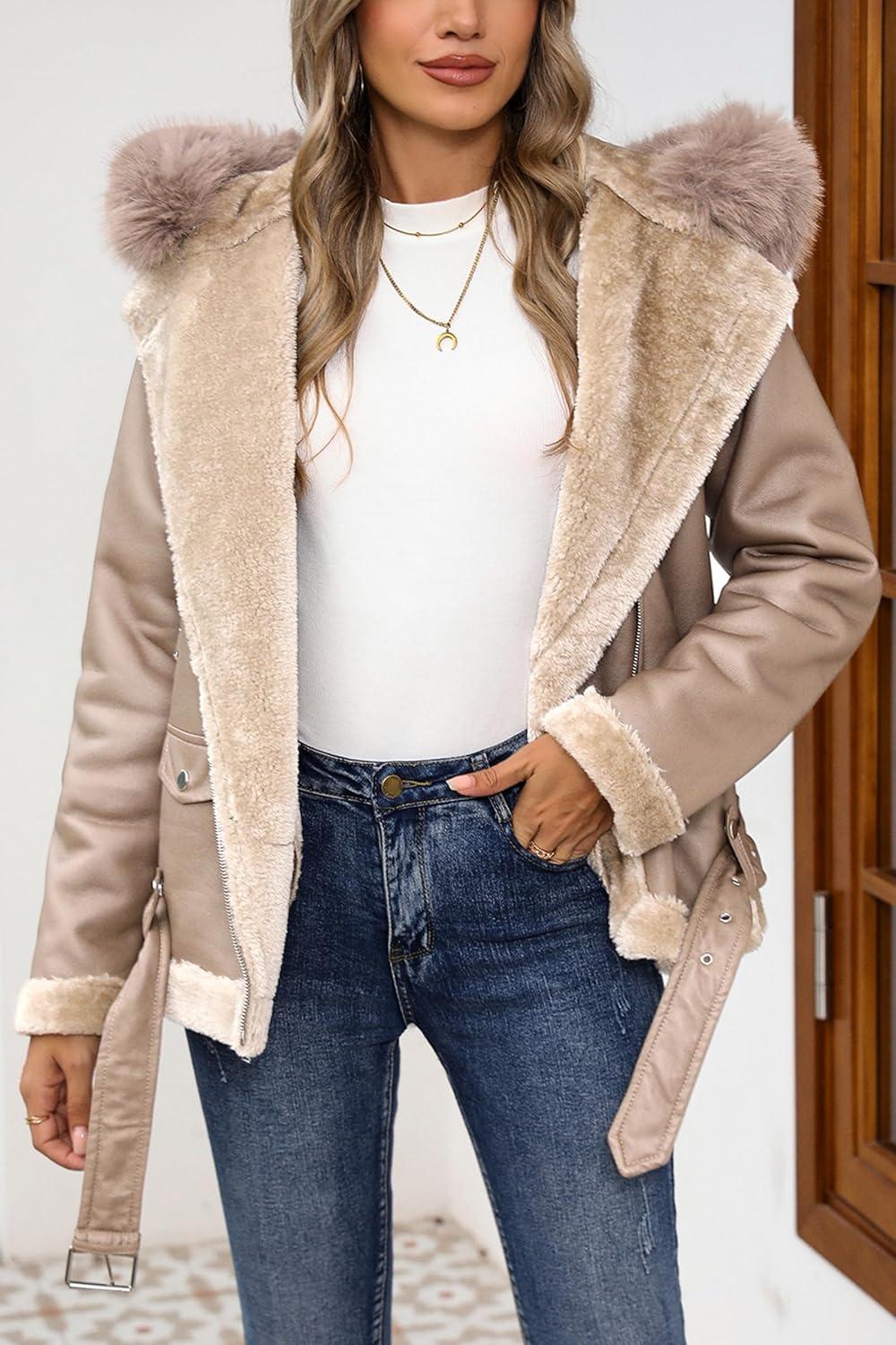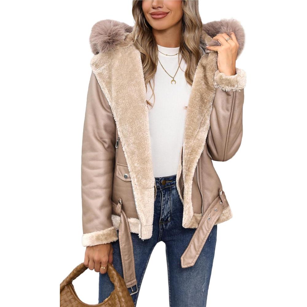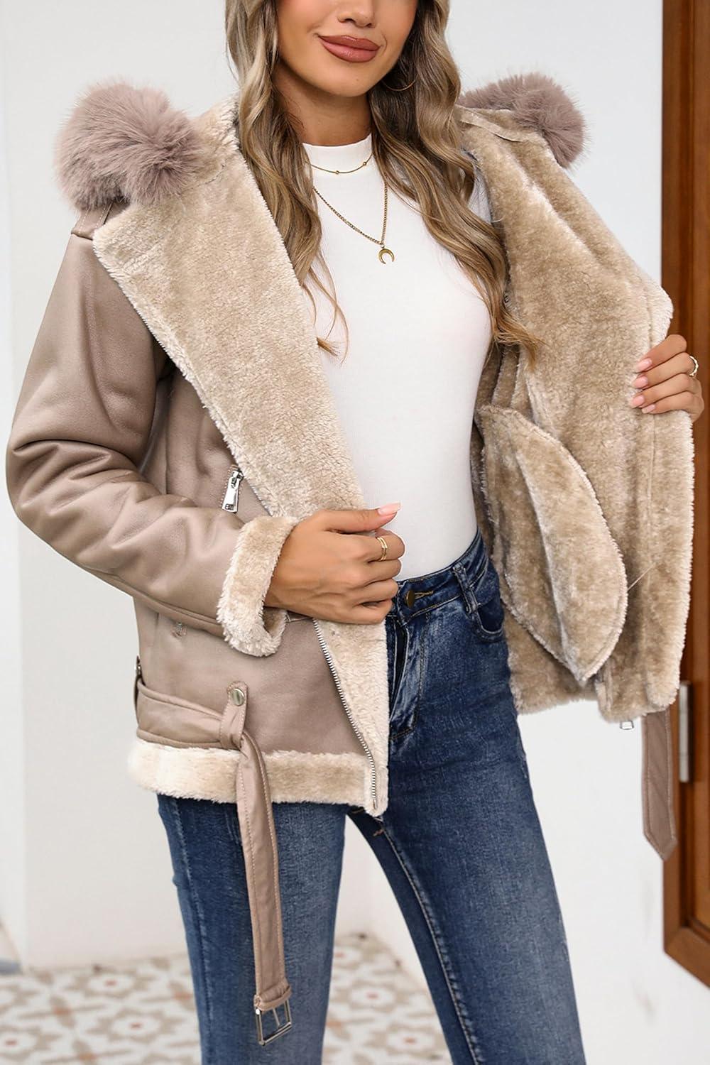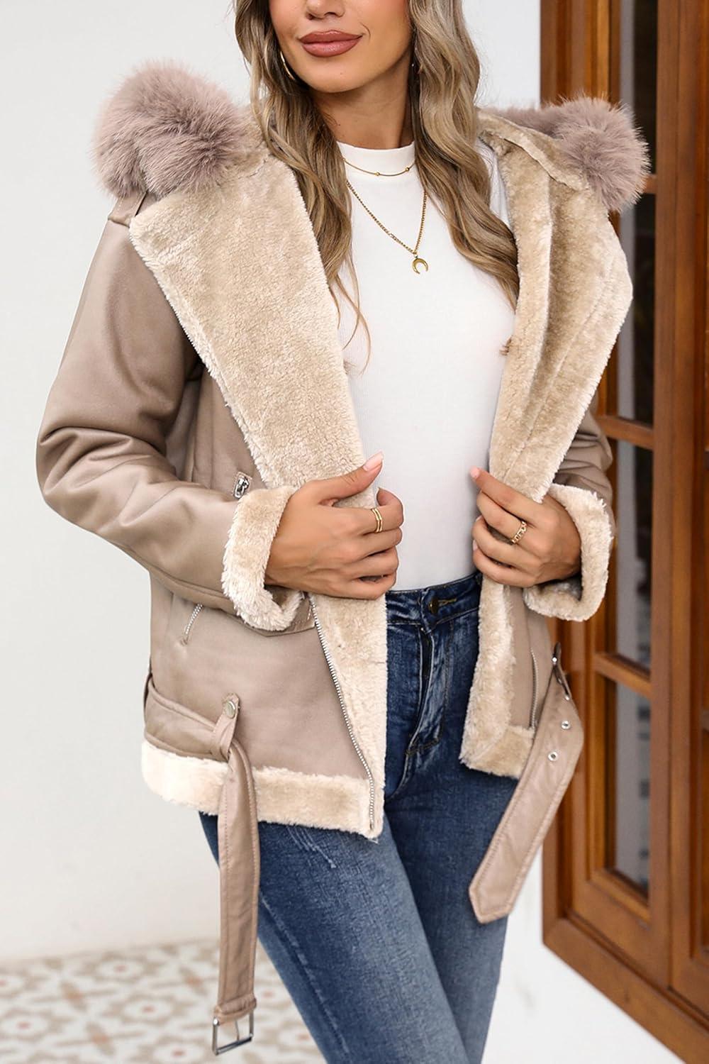 Bellivera Women’s Faux Leather Jacket Moto Biker Sherpa-Lined Coat with Removable Fur Collar(Khaki Shearling Lined)