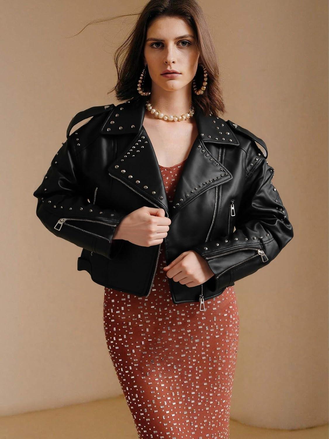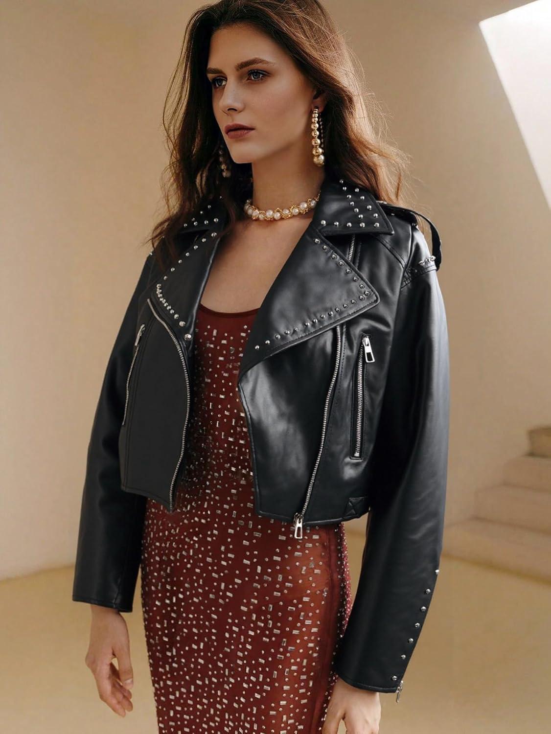 Bellivera Women’s Faux Leather Jacket Studded Rivet Casual Short Moto Biker Stand Collar Coat(Black Cropped)