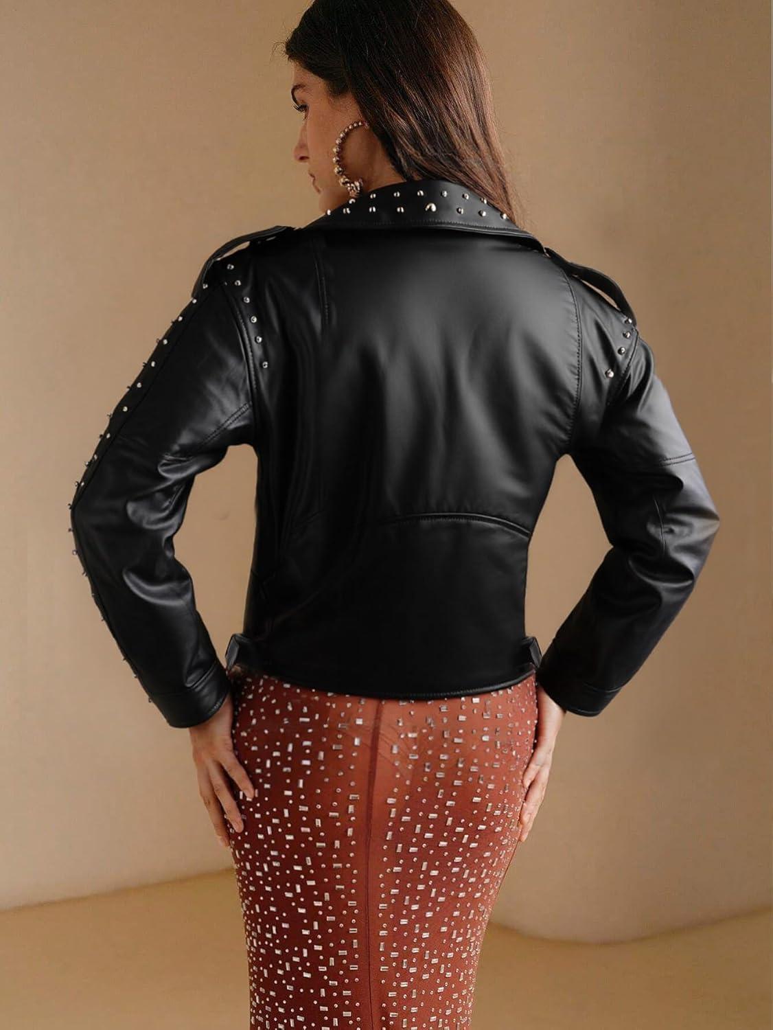Bellivera Women’s Faux Leather Jacket Studded Rivet Casual Short Moto Biker Stand Collar Coat(Black Jacket With Belt)