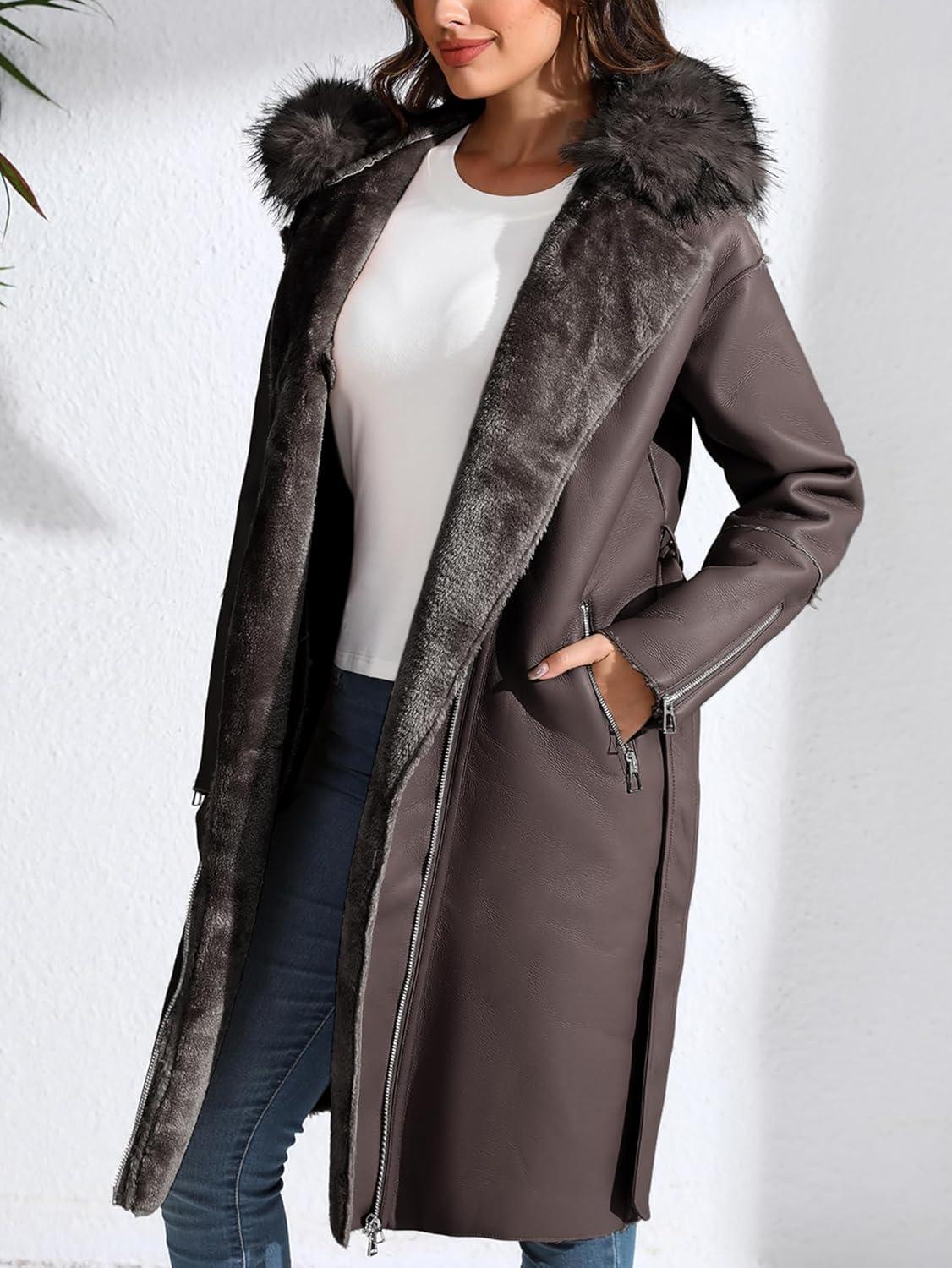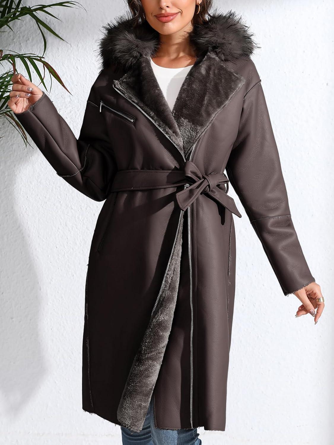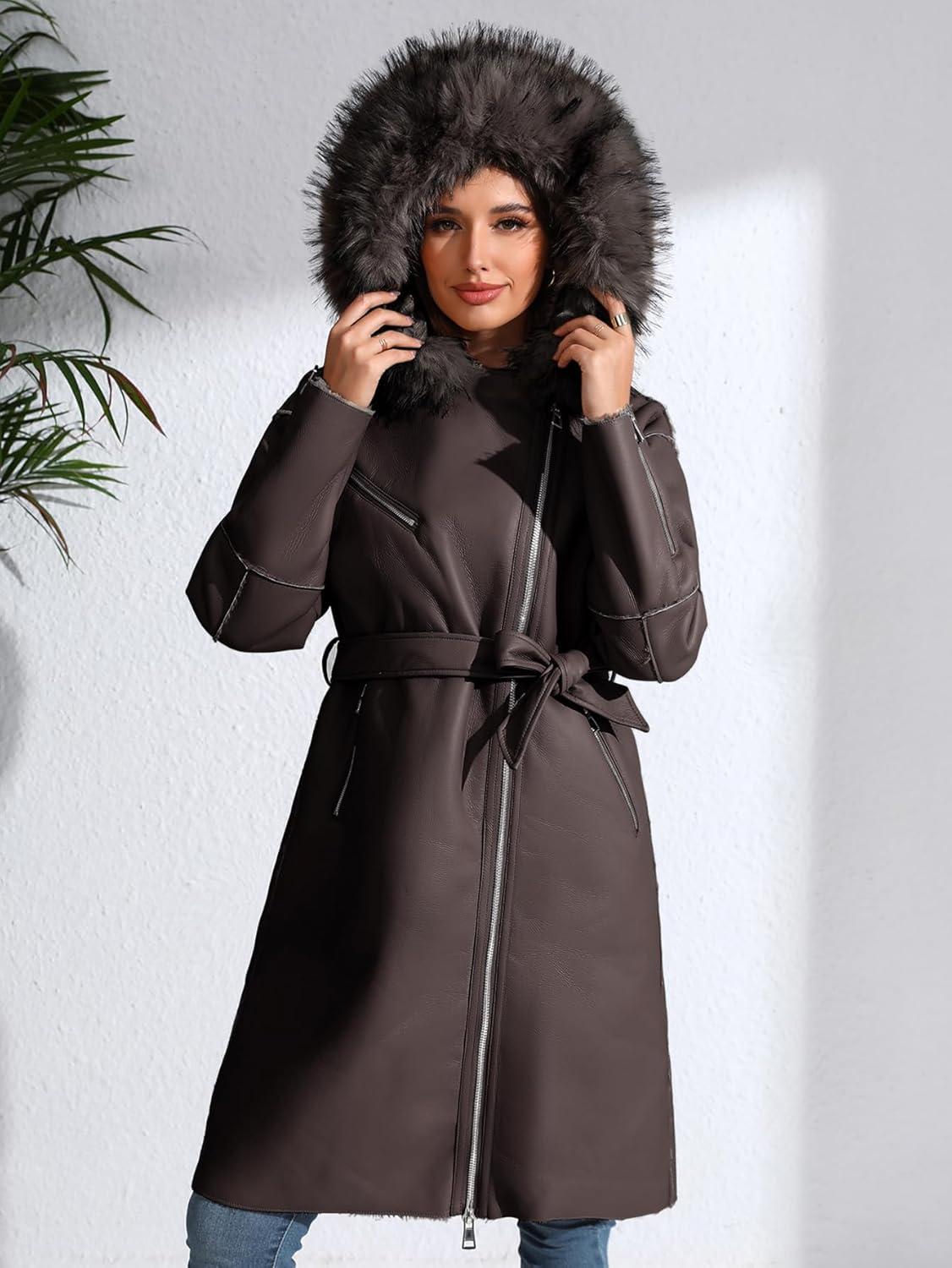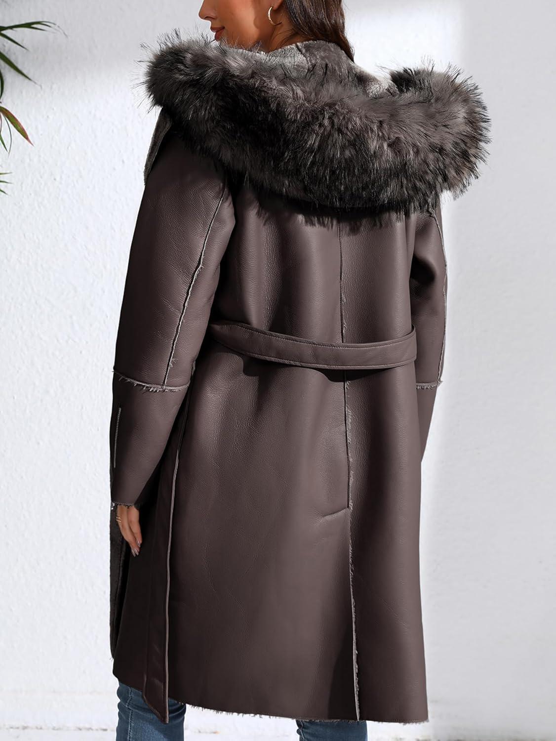 Bellivera Women’s Faux Leather Trench Coat with Faux Fur Hood Casual Thick Shearling Lined Knee-Length Winter Outerwear(Coffee)