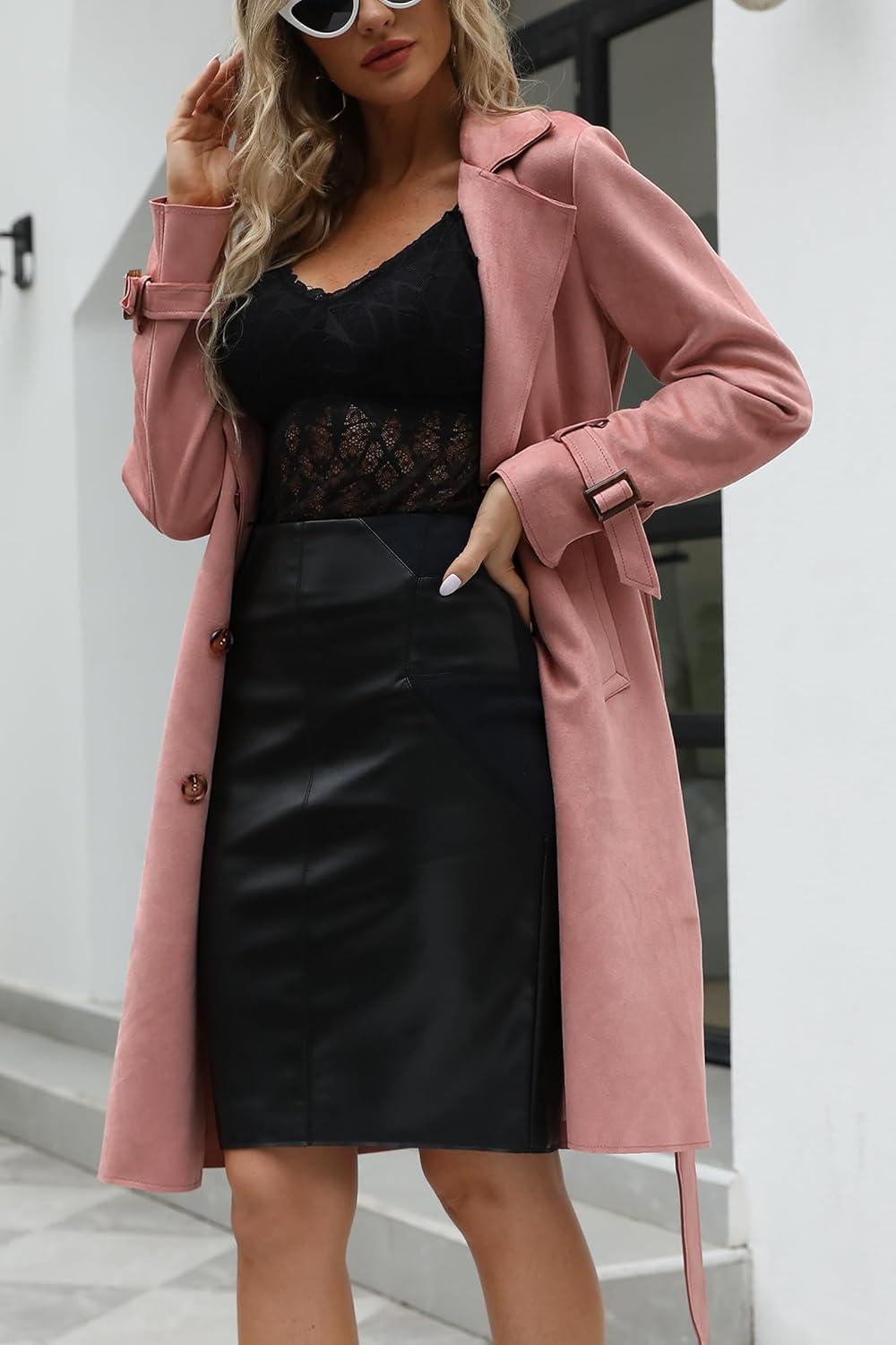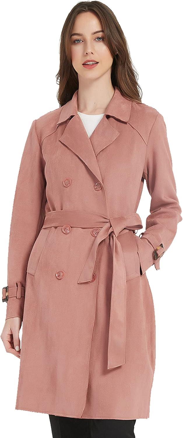 Bellivera Womens Faux Suede Leather Jacket Spring and Winter Fashion Long Trench Coat, Lightweight Windbreaker(Pink)