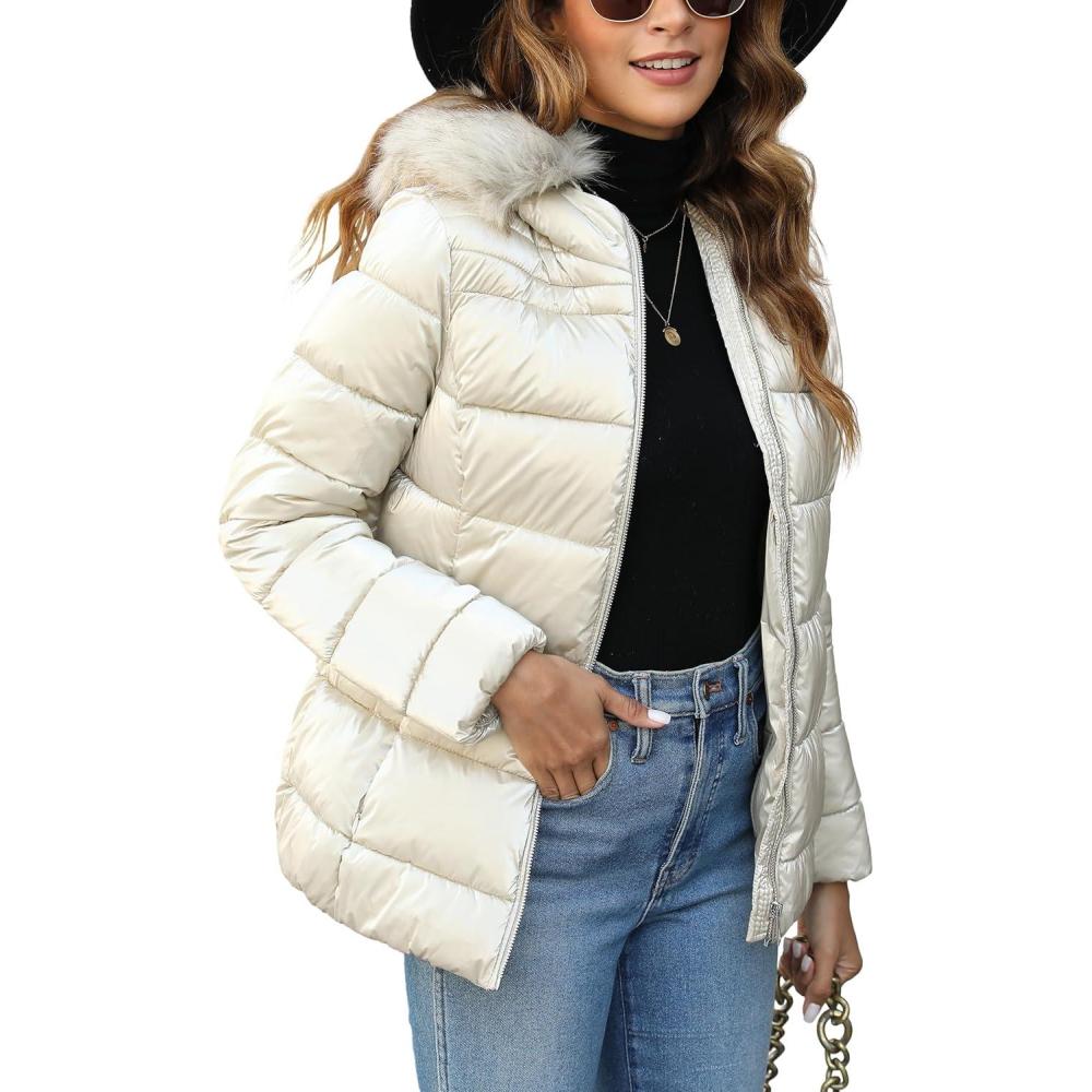 Bellivera Womens Lightweight Puffer Jacket, Winter Coats for Women Warm Quilted Bubble Padded Hood Coat with Faux Fur Collar(Khaki)