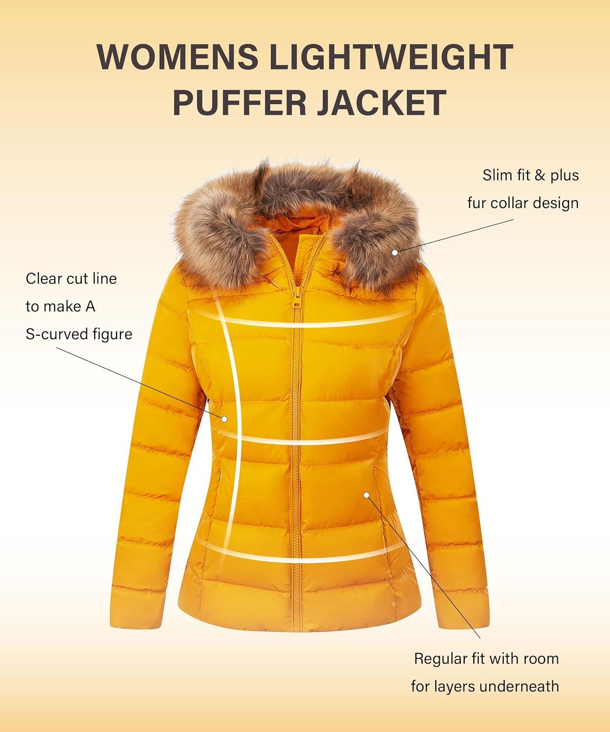 Bellivera Womens Lightweight Puffer Jacket, Winter Coats for Women Warm Quilted Bubble Padded Hood Coat with Faux Fur Collar(Yellow)