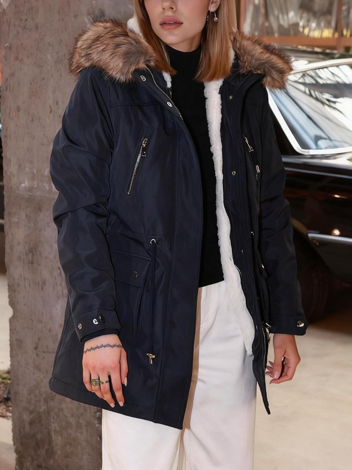 This parka jacket is designed to keep you warm and stylish during the colder months. The relaxed fit and adjustable drawstring waist make it a comfortable and flattering choice for all body types. Featuring a classic hood with faux fur trim, this parka adds a touch of sophistication and coziness to any outfit. The multiple pockets offer practicality and convenience, allowing you to keep your essentials close at hand while on the go
