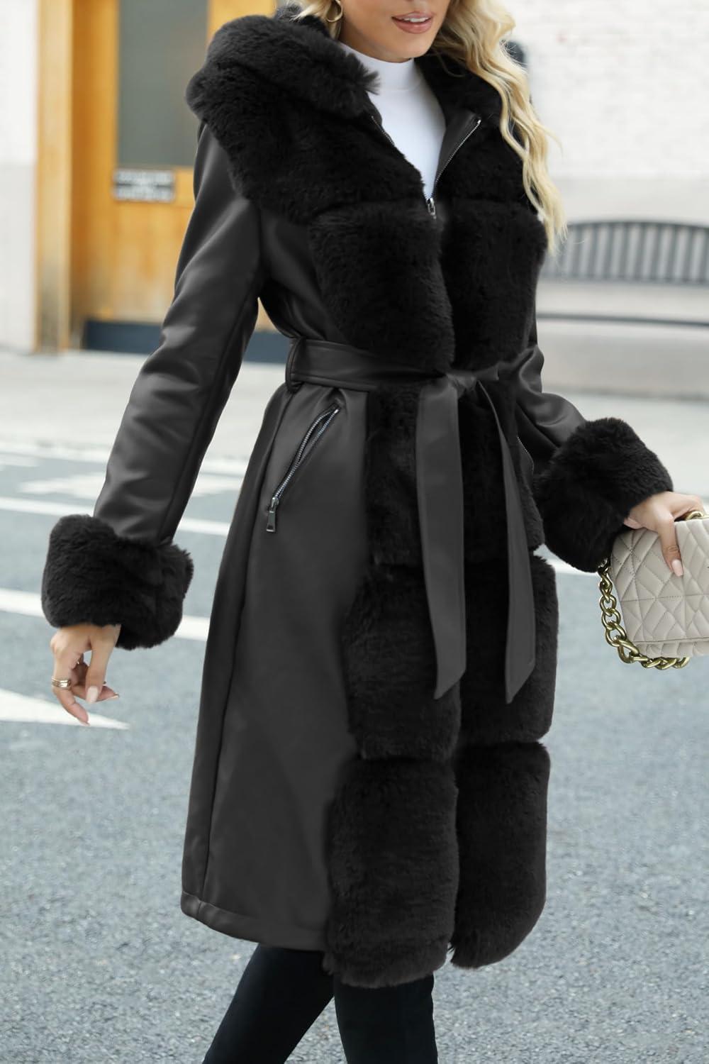 Bellivera Women’s Wool Pea Coat Faux Fur Jacket Winter Warm Parka Overcoat with Belt(Black Leather With Hood)