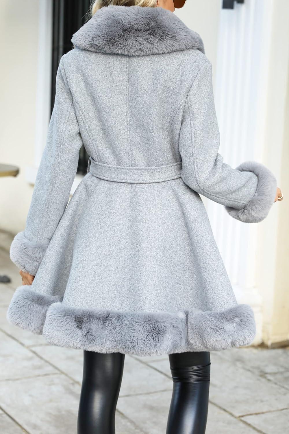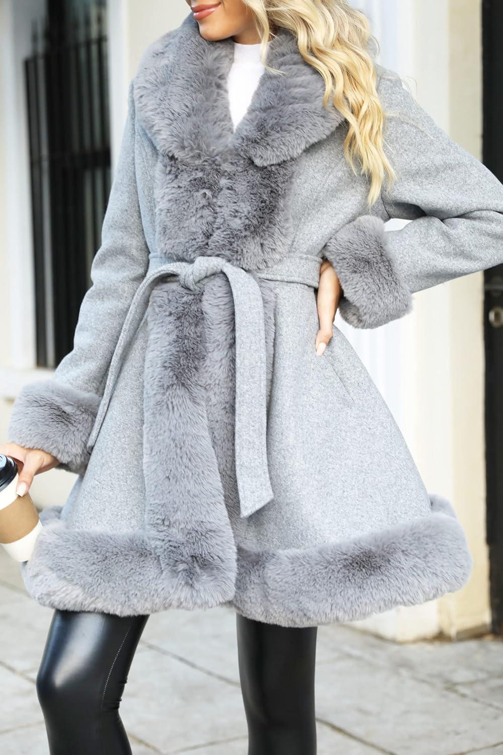 Bellivera Women’s Wool Pea Coat Faux Fur Jacket Winter Warm Parka Overcoat with Belt(Grey)