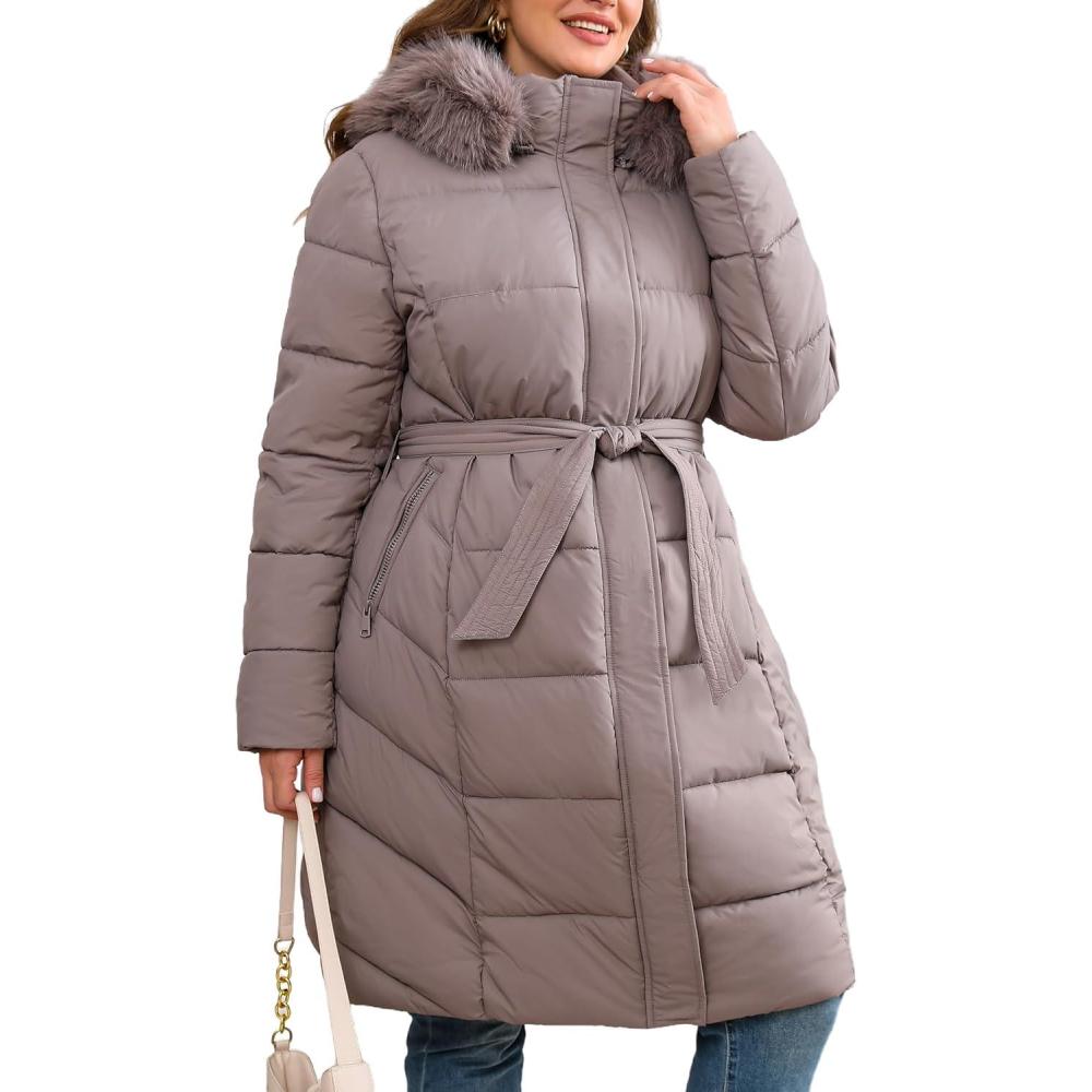 Geschallino Women Puffer Jacket Plus Size Long Parka Belted Winter Warm Hood Coat(D.apricot)